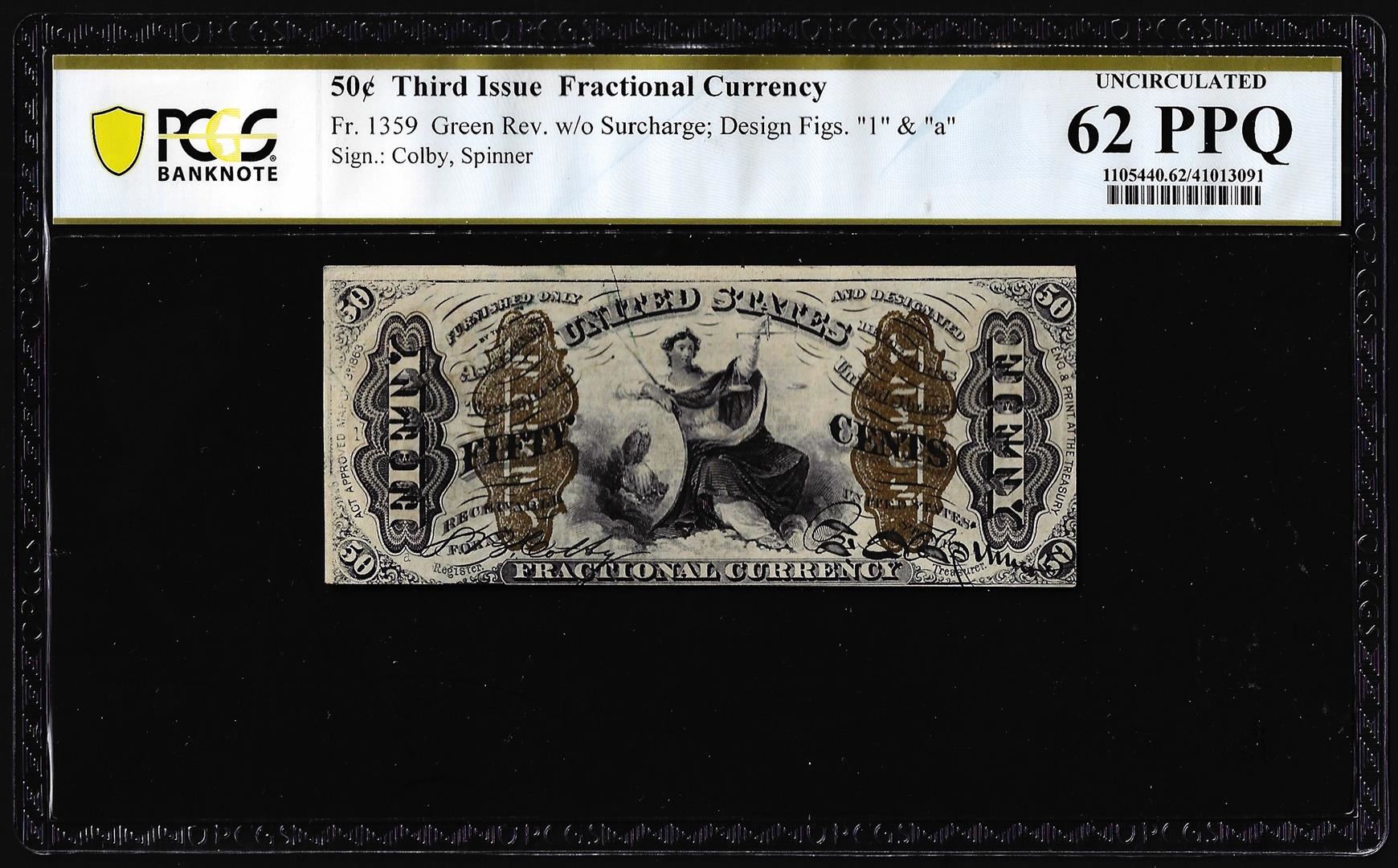 One 1863 Third Issue 50 Cents Spinner Fractional Currency Note PCGS Uncirculated 62PPQ. PCGS Graded.