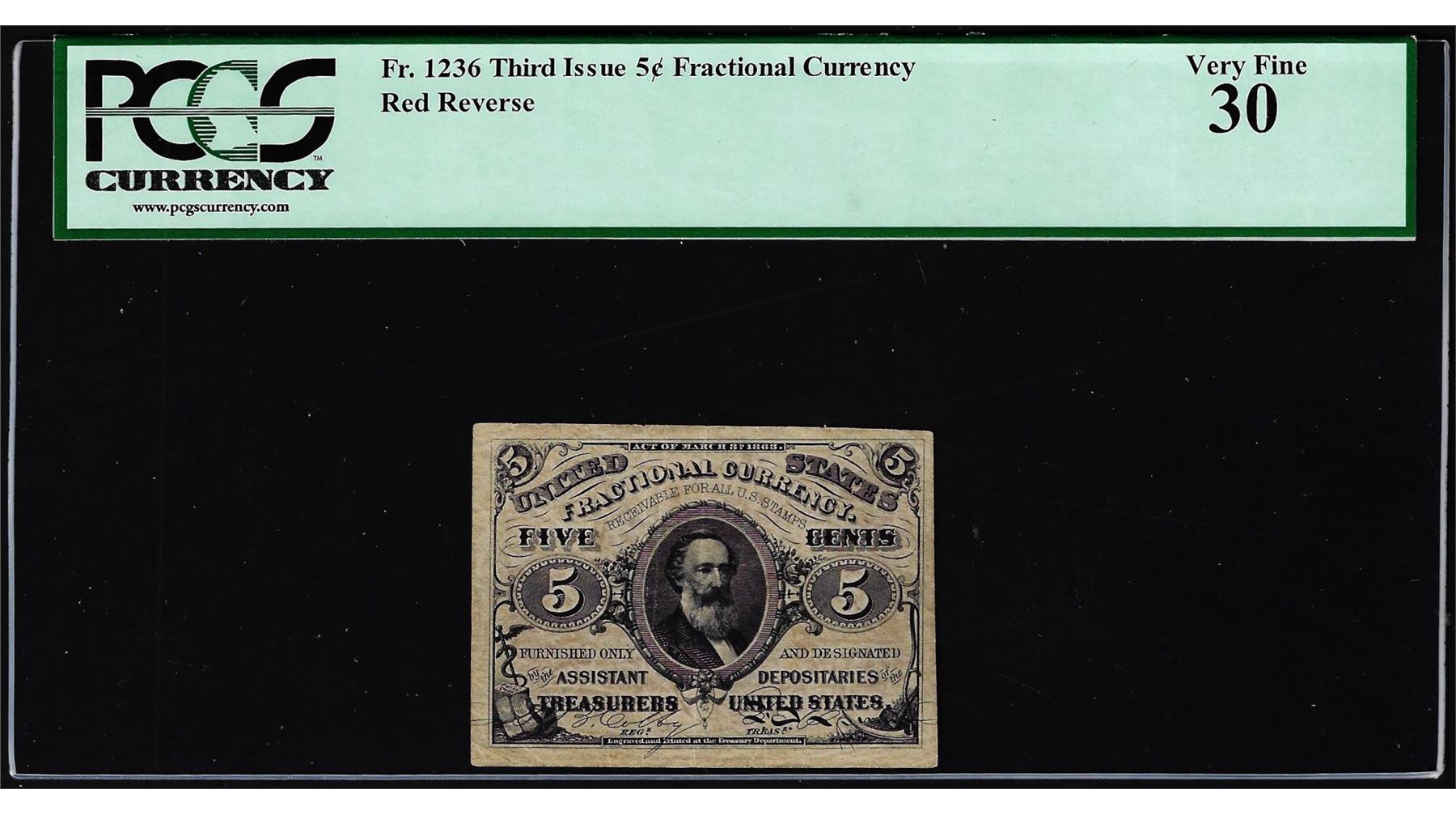One 1863 Third Issue Five Cents Fractional Currency Note Fr.1236 PCGS Very Fine 30. PCGS Graded.