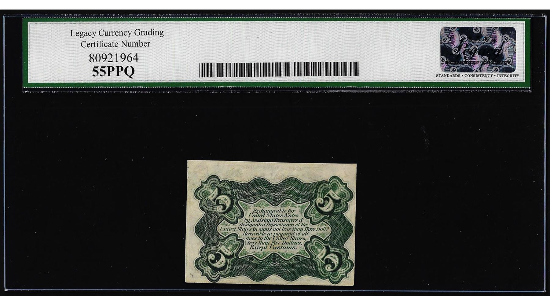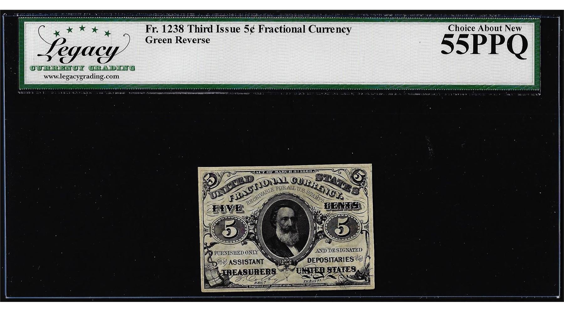 One 1863 Third Issue Five Cents Fractional Note Fr.1238 Legacy Choice About New 55PPQ. Legacy Graded.