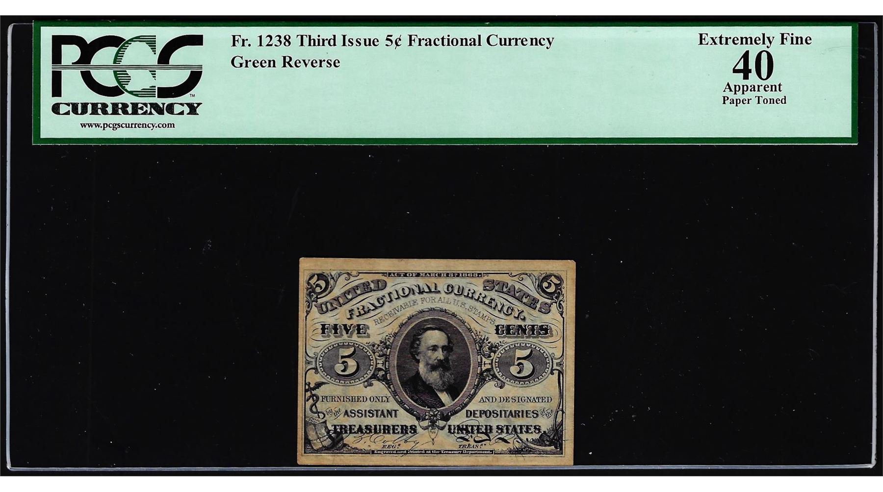 One 1863 Third Issue Five Cents Fractional Note Fr.1238 PCGS Extremely Fine 40 Apparent. PCGS Graded.