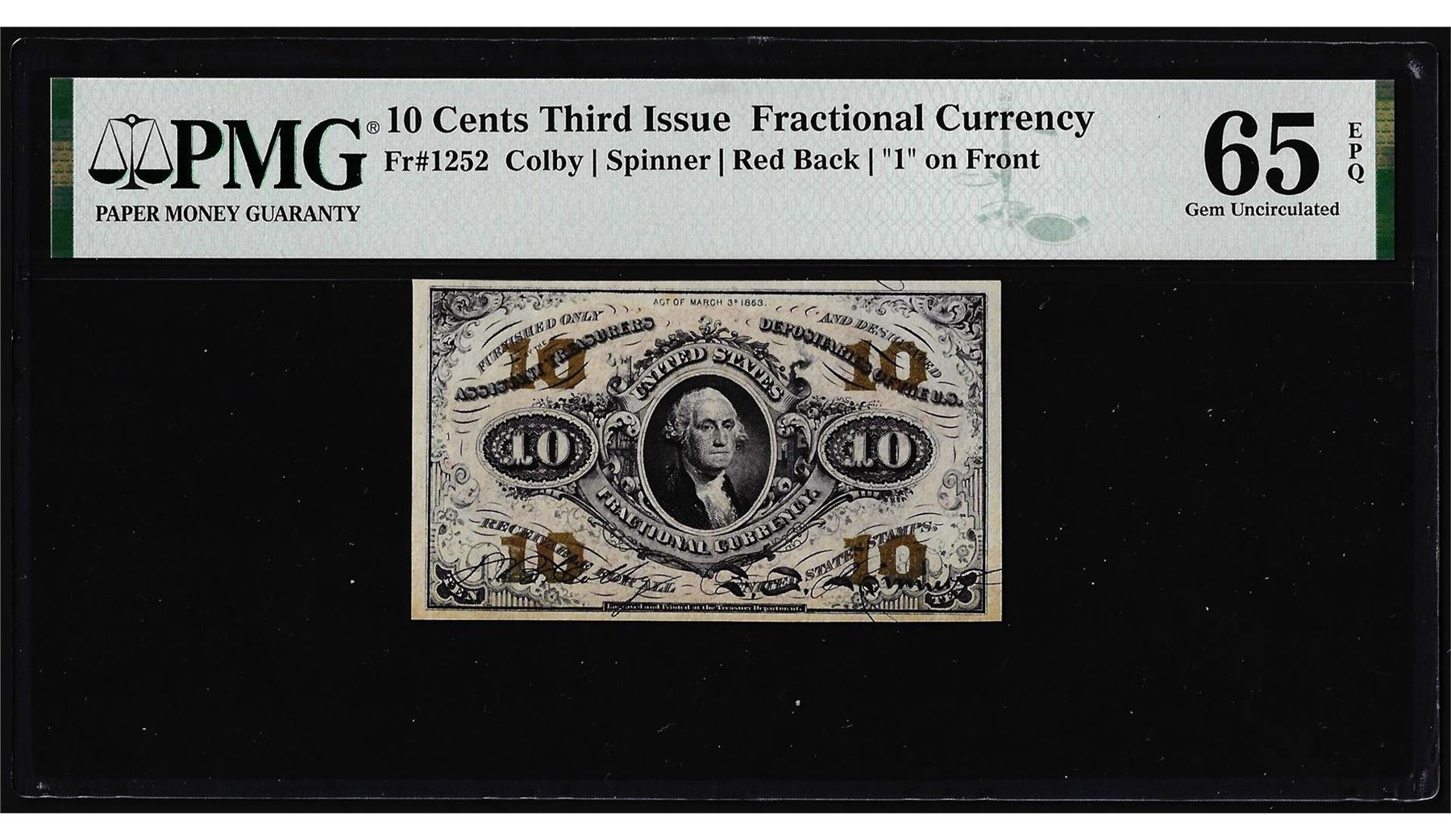 One 1863 Third Issue Ten Cents Fractional Currency Note Fr.1252 PMG Gem Uncirculated 65EPQ. PMG Certified.