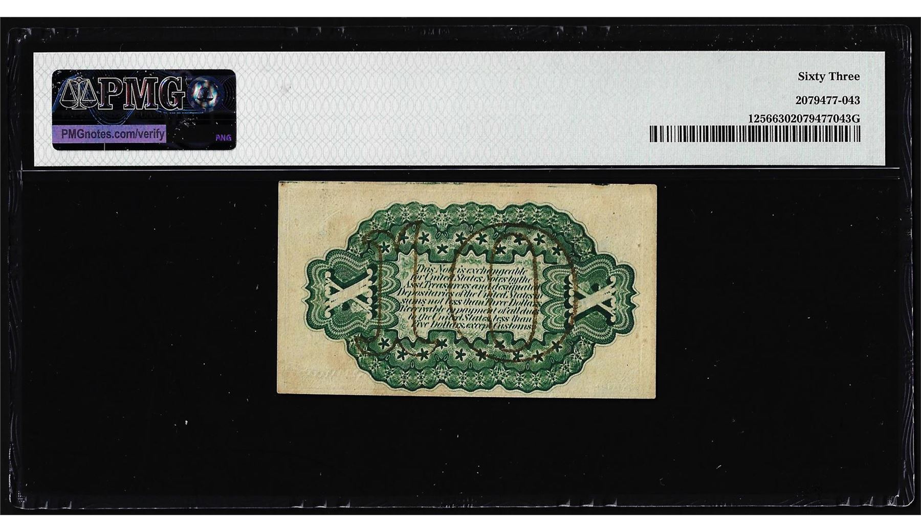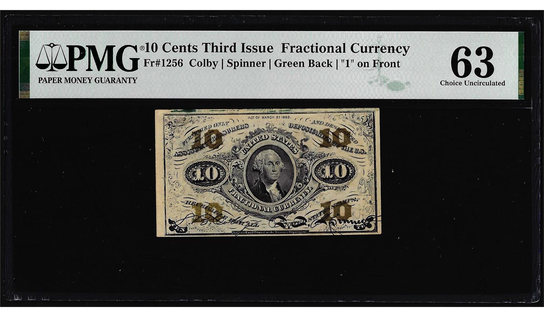 One 1863 Third Issue Ten Cents Fractional Note Fr.1256 PMG Choice Uncirculated 63. PMG Certified.