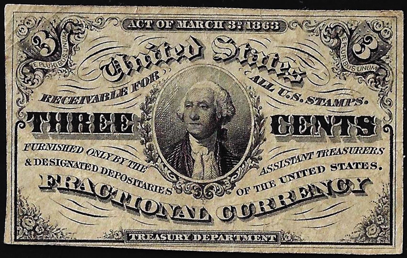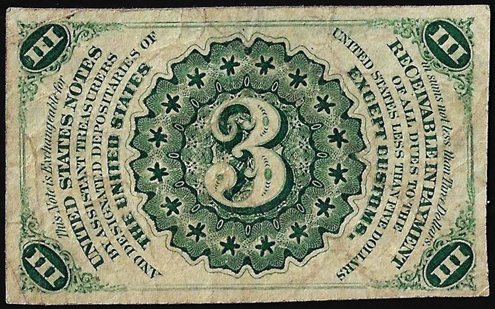 One 1863 Third Issue Three Cents Fractional Currency Note.