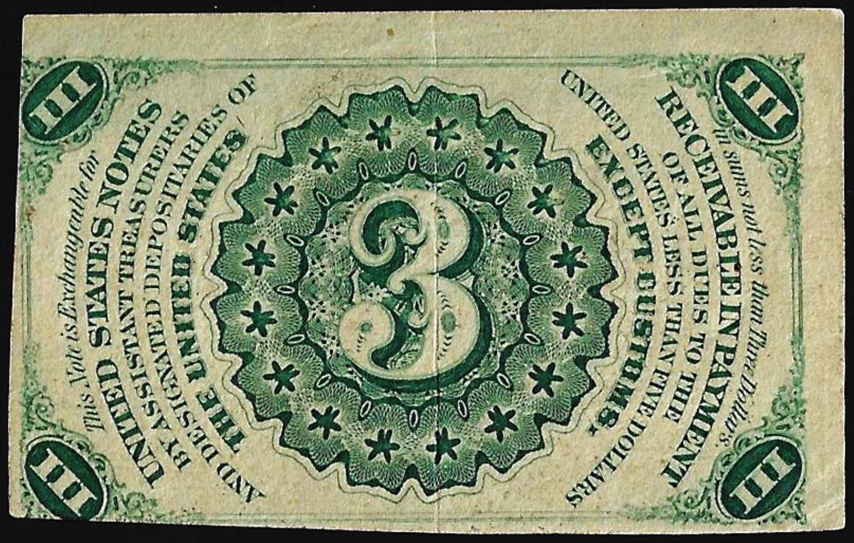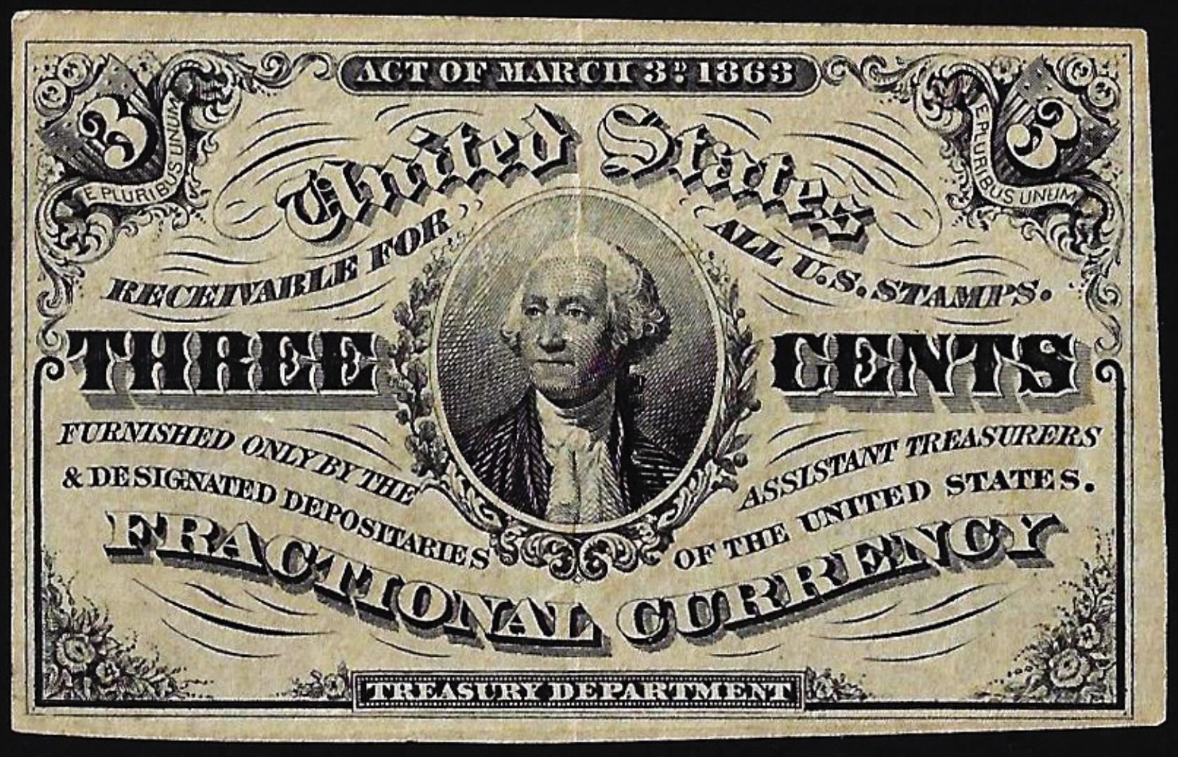 One 1863 Third Issue Three Cents Fractional Currency Note.