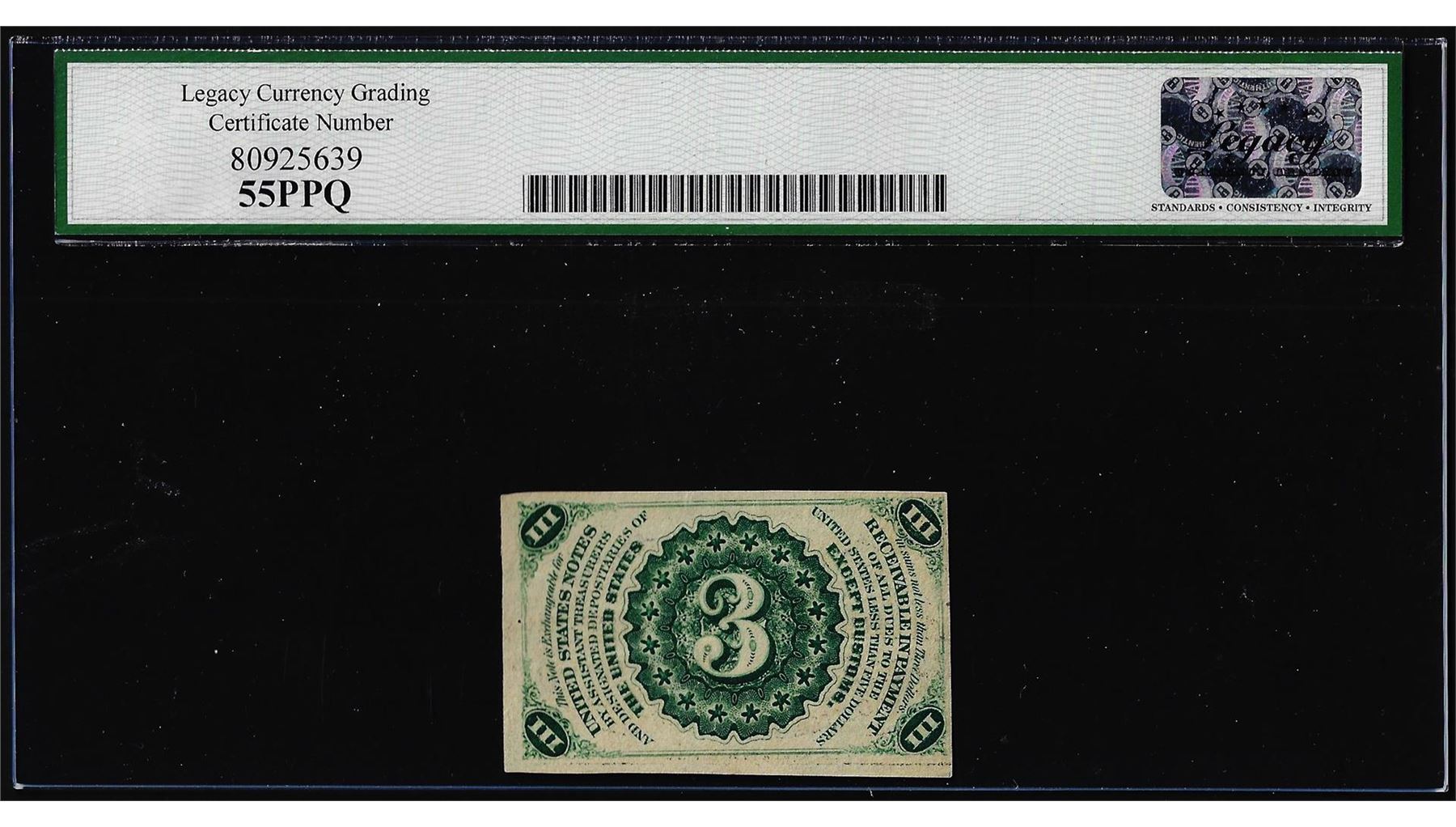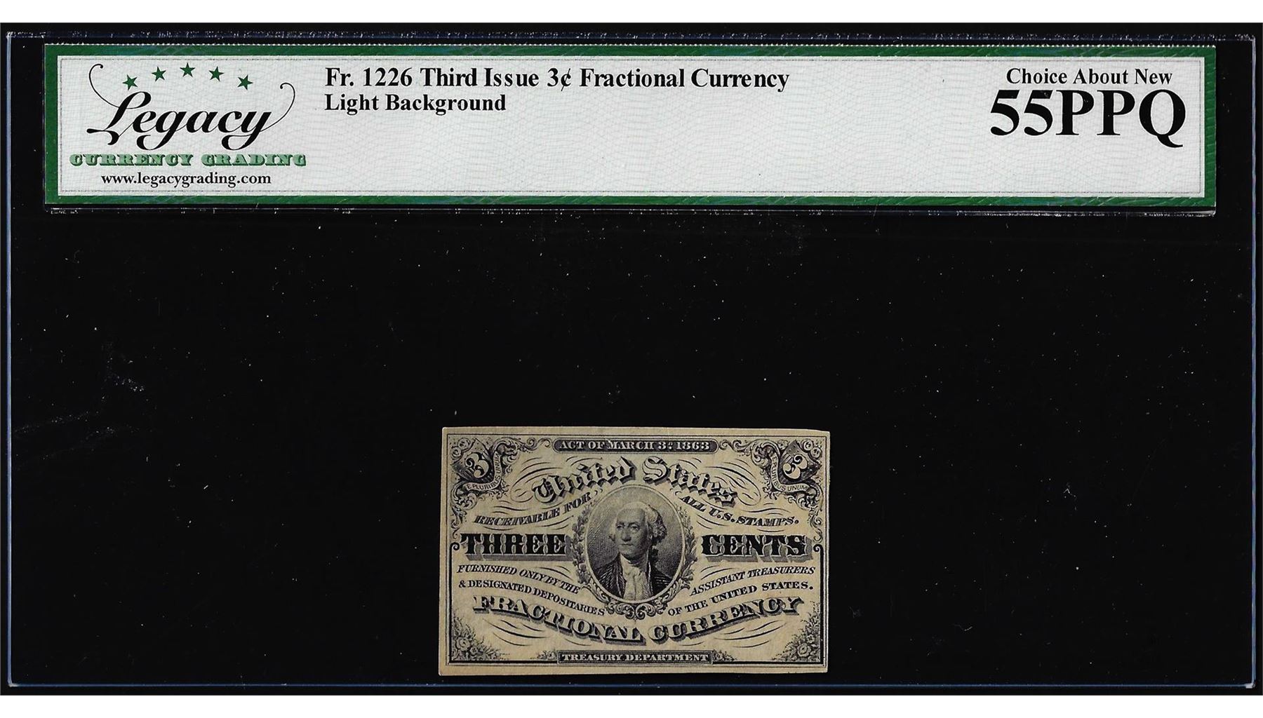 One 1863 Third Issue Three Cents Fractional Note Fr.1226 Legacy Choice About New 55PPQ. Legacy Graded.