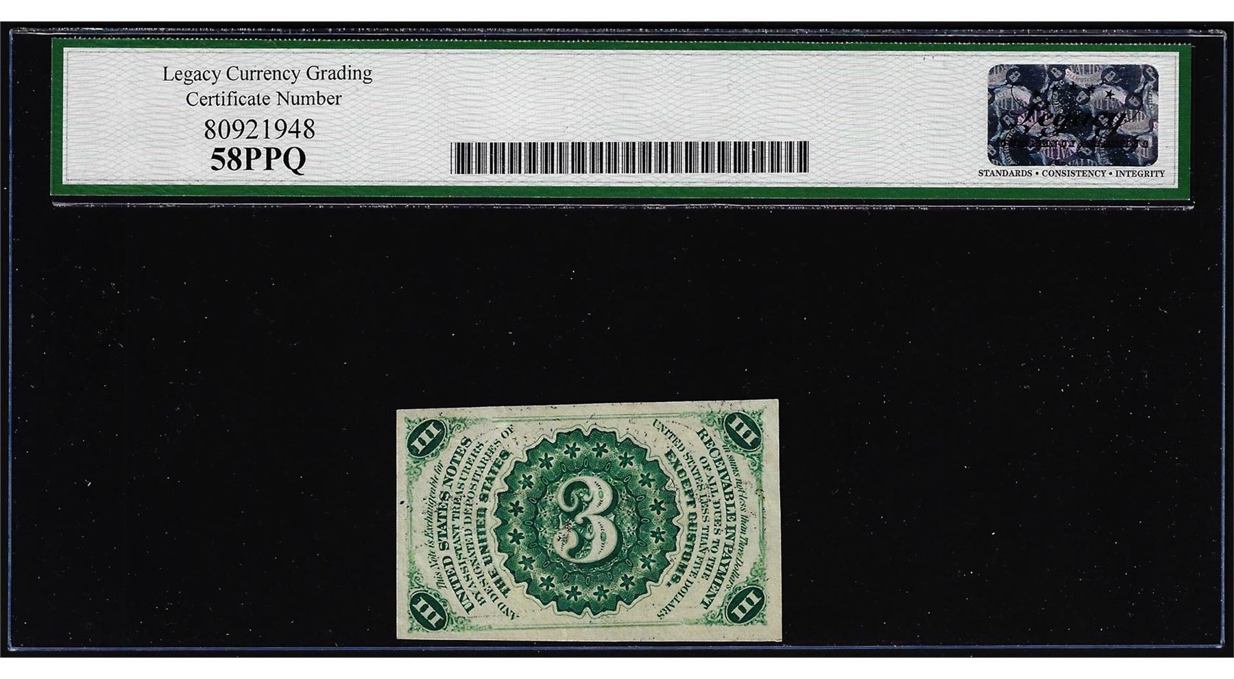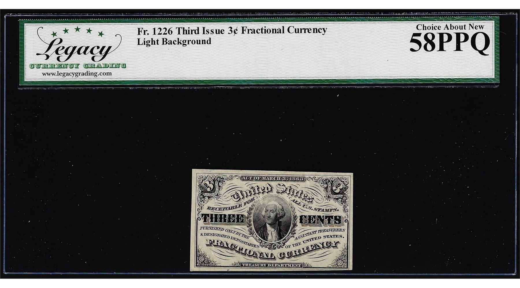 One 1863 Third Issue Three Cents Fractional Note Fr.1226 Legacy Choice About New 58PPQ. Legacy Graded.