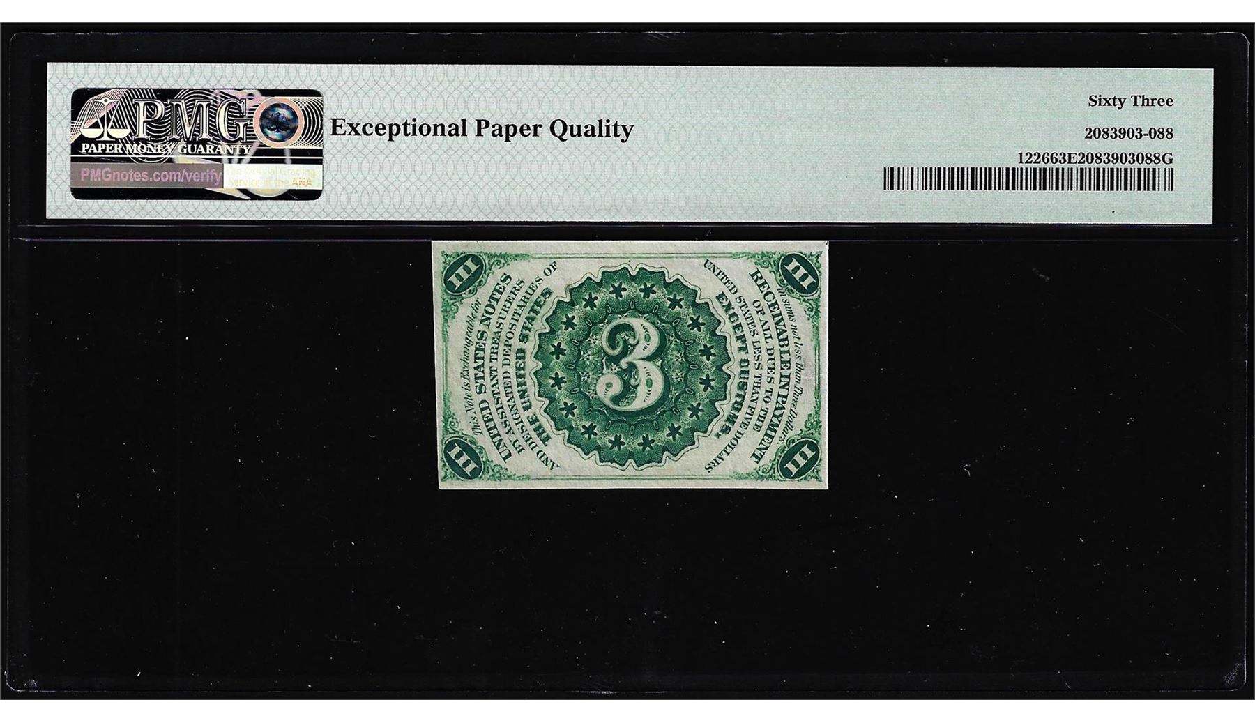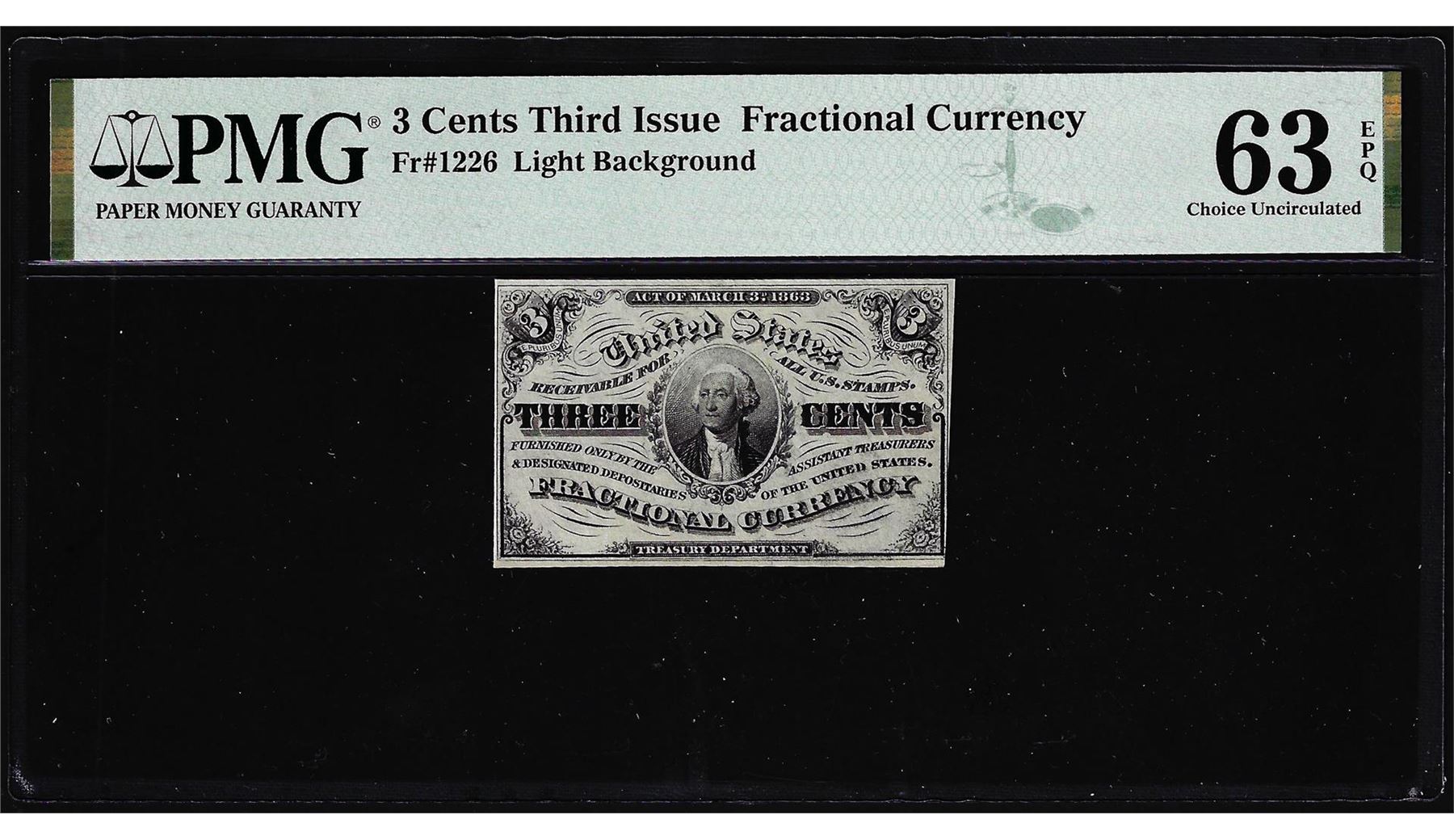 One 1863 Third Issue Three Cents Fractional Note Fr.1226 PMG Choice Uncirculated 63EPQ. PMG Certified.