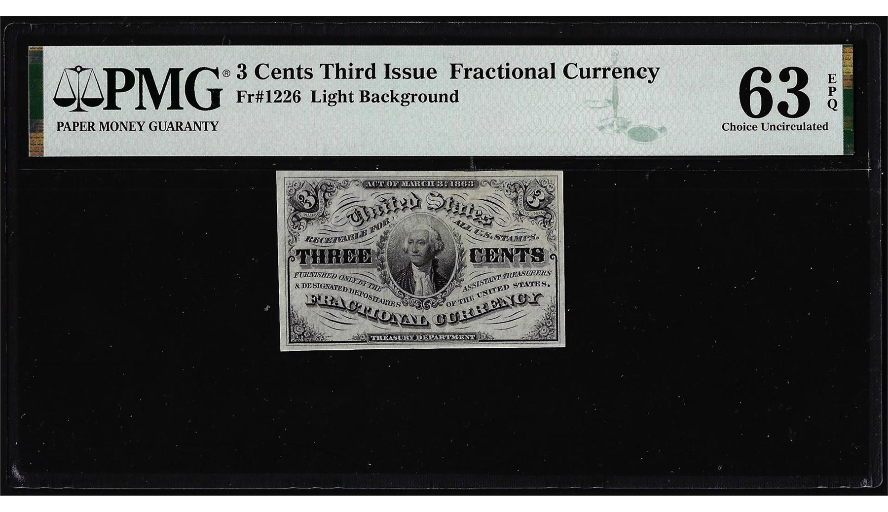 One 1863 Third Issue Three Cents Fractional Note Fr.1226 PMG Choice Uncirculated 63EPQ. PMG Certified.