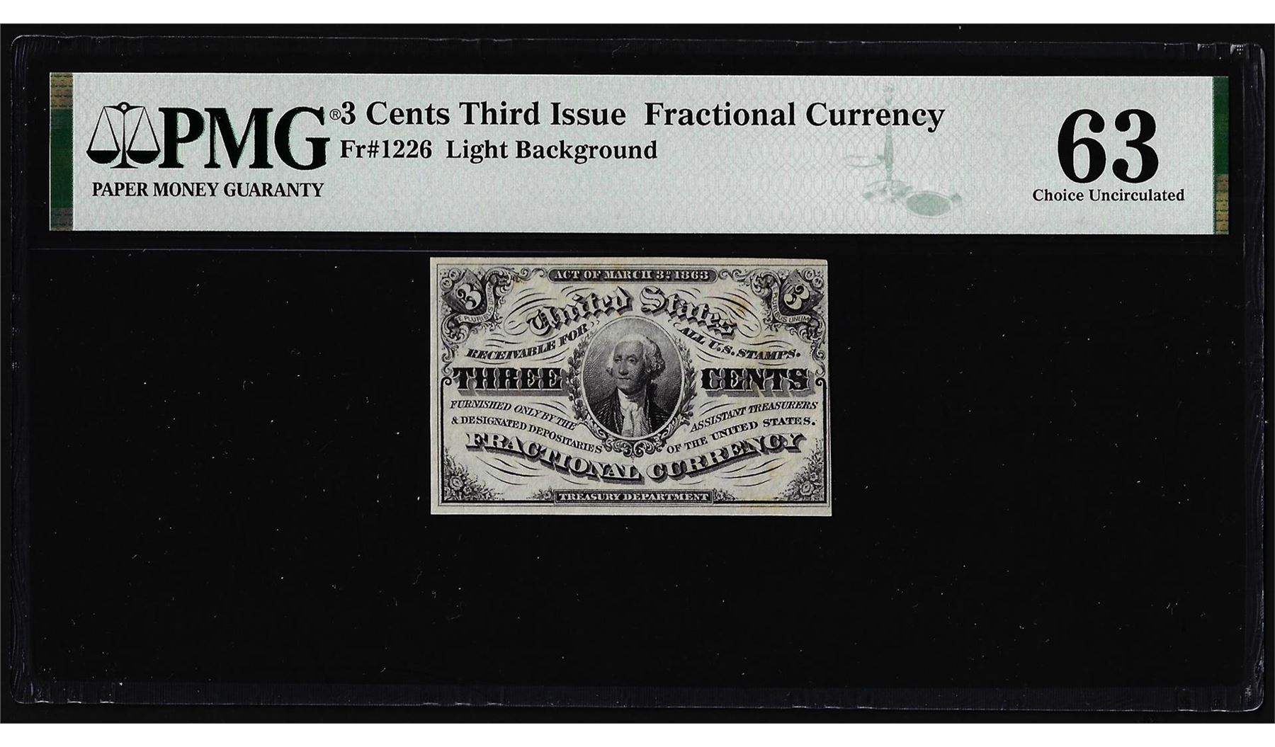 One 1863 Third Issue Three Cents Fractional Note Fr.1226 PMG Choice Uncirculated 63. PMG Certified.