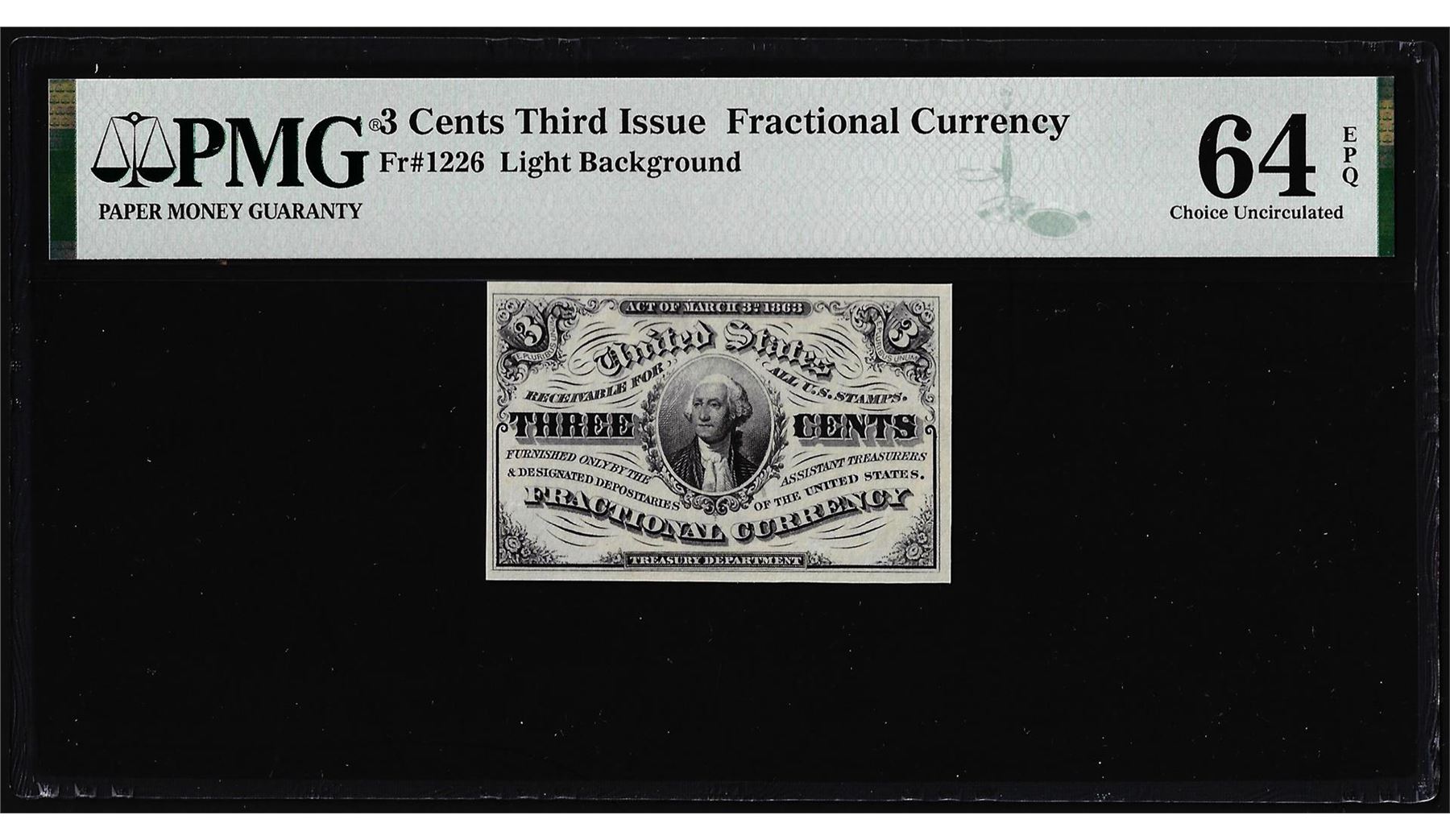 One 1863 Third Issue Three Cents Fractional Note Fr.1226 PMG Choice Uncirculated 64EPQ. PMG Certified.
