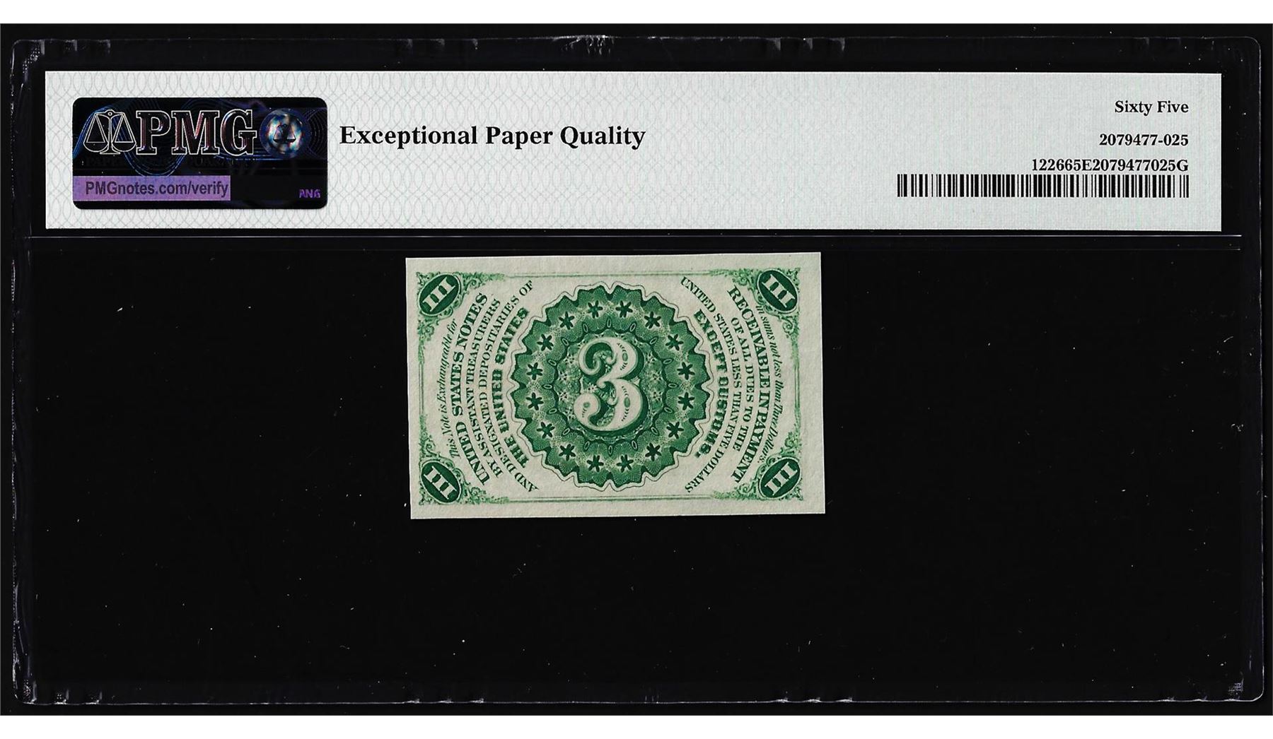 One 1863 Third Issue Three Cents Fractional Note Fr.1226 PMG Gem Uncirculated 65EPQ. PMG Certified.