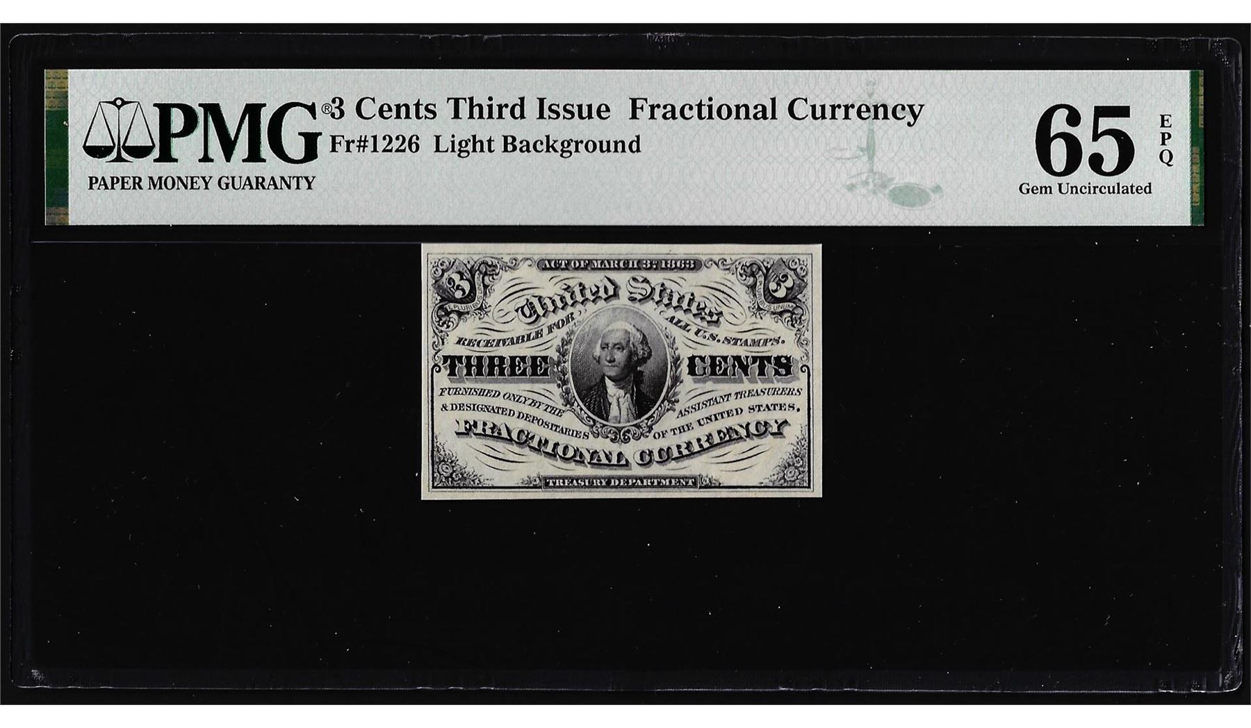 One 1863 Third Issue Three Cents Fractional Note Fr.1226 PMG Gem Uncirculated 65EPQ. PMG Certified.