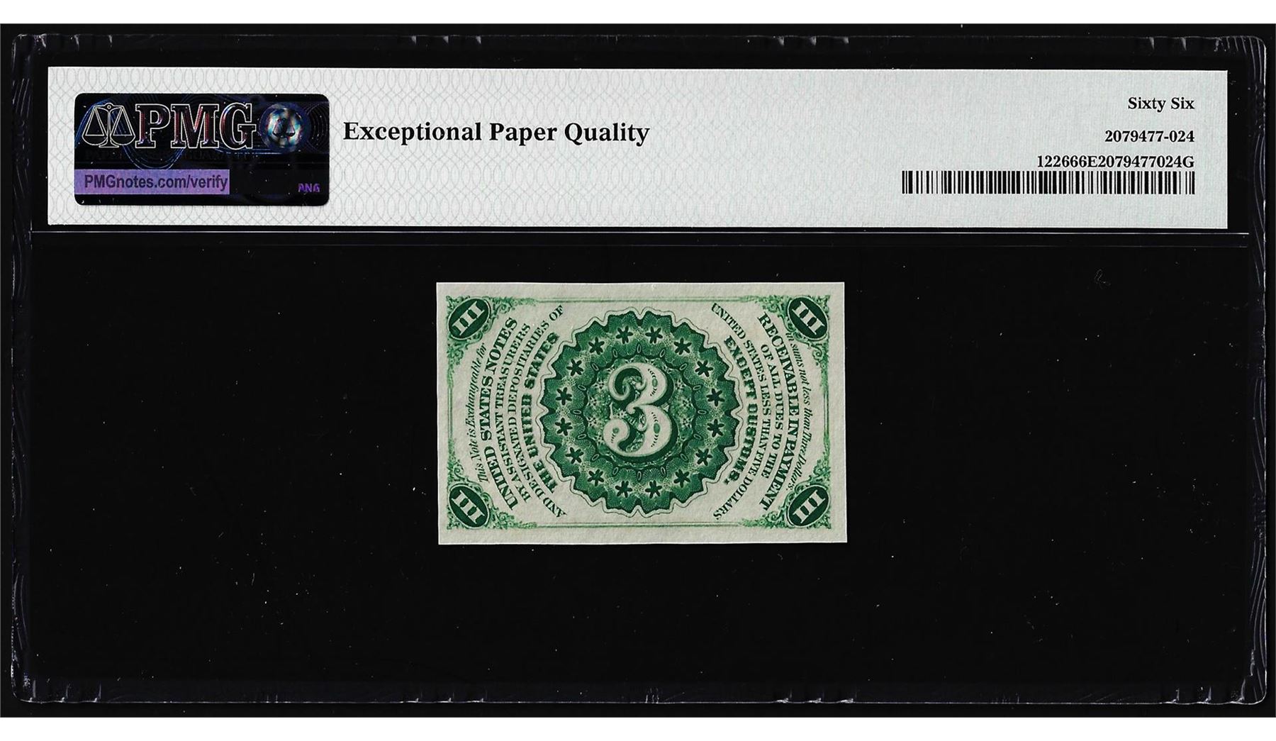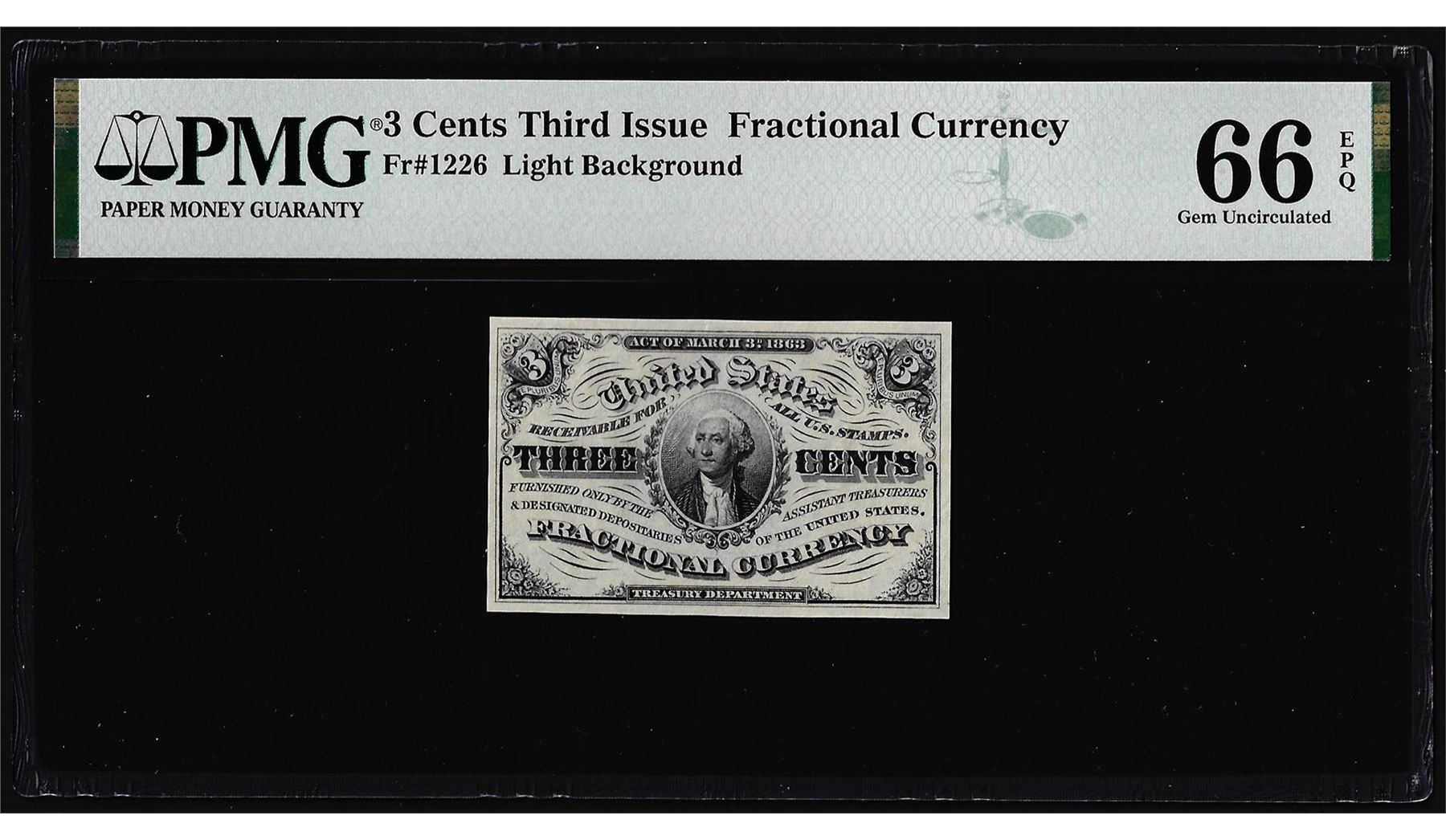One 1863 Third Issue Three Cents Fractional Note Fr.1226 PMG Gem Uncirculated 66EPQ. PMG Certified.