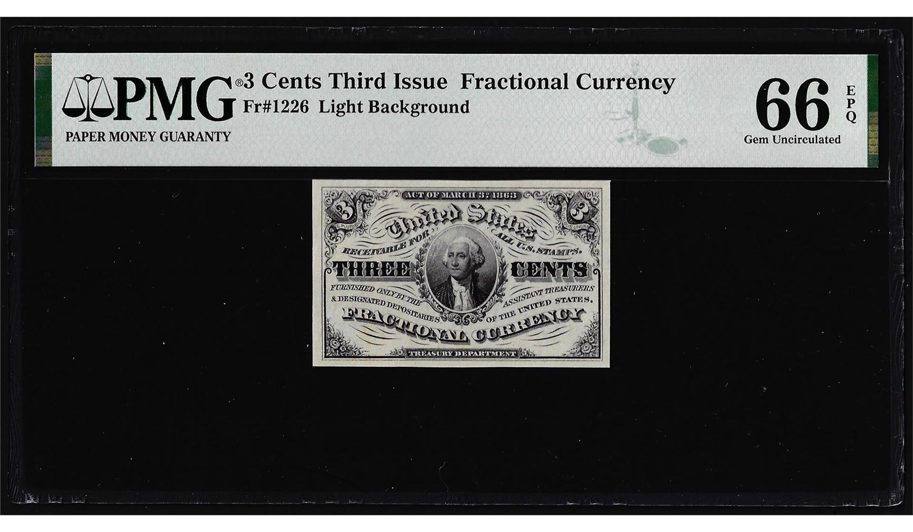 One 1863 Third Issue Three Cents Fractional Note Fr.1226 PMG Gem Uncirculated 66EPQ. PMG Certified.