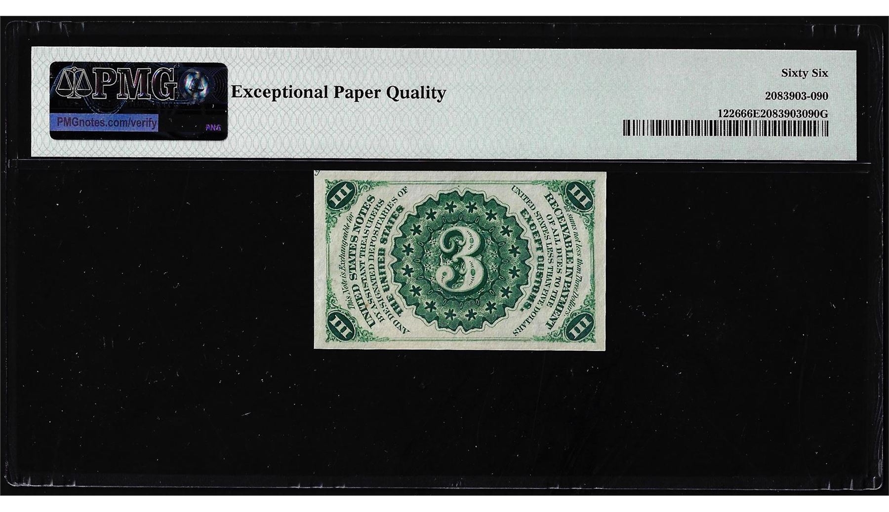 One 1863 Third Issue Three Cents Fractional Note Fr.1226 PMG Gem Uncirculated 66EPQ. PMG Certified.