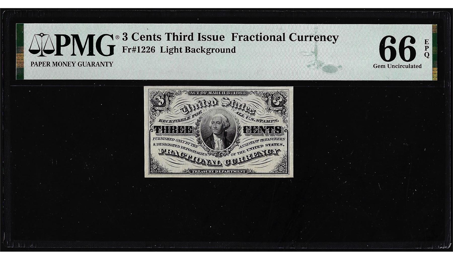 One 1863 Third Issue Three Cents Fractional Note Fr.1226 PMG Gem Uncirculated 66EPQ. PMG Certified.