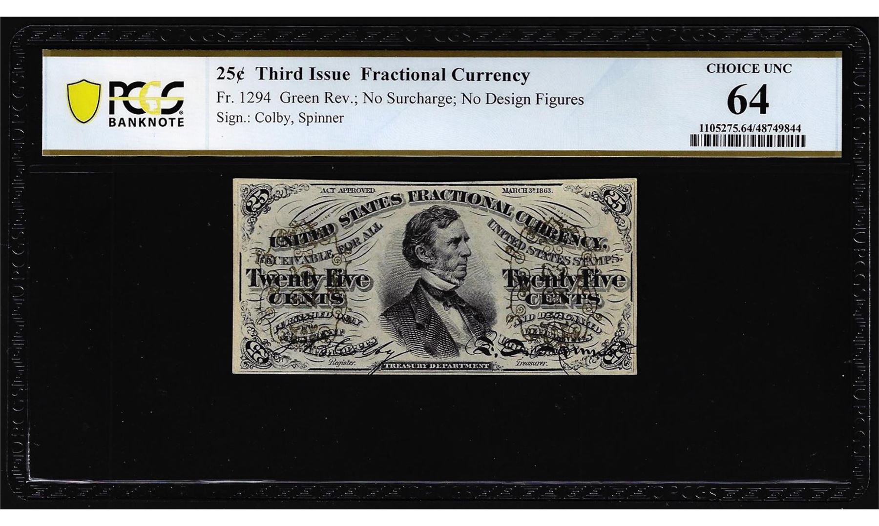 1863 Third Issue Twenty-Five Cents Fractional Currency Note Fr.1294 PCGS Choice Unc 64