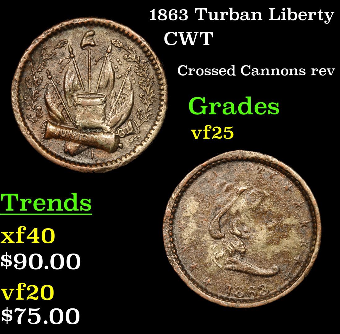 1863 Turban Liberty Crossed Cannons rev . Civil War Token 1c Grades vf+.