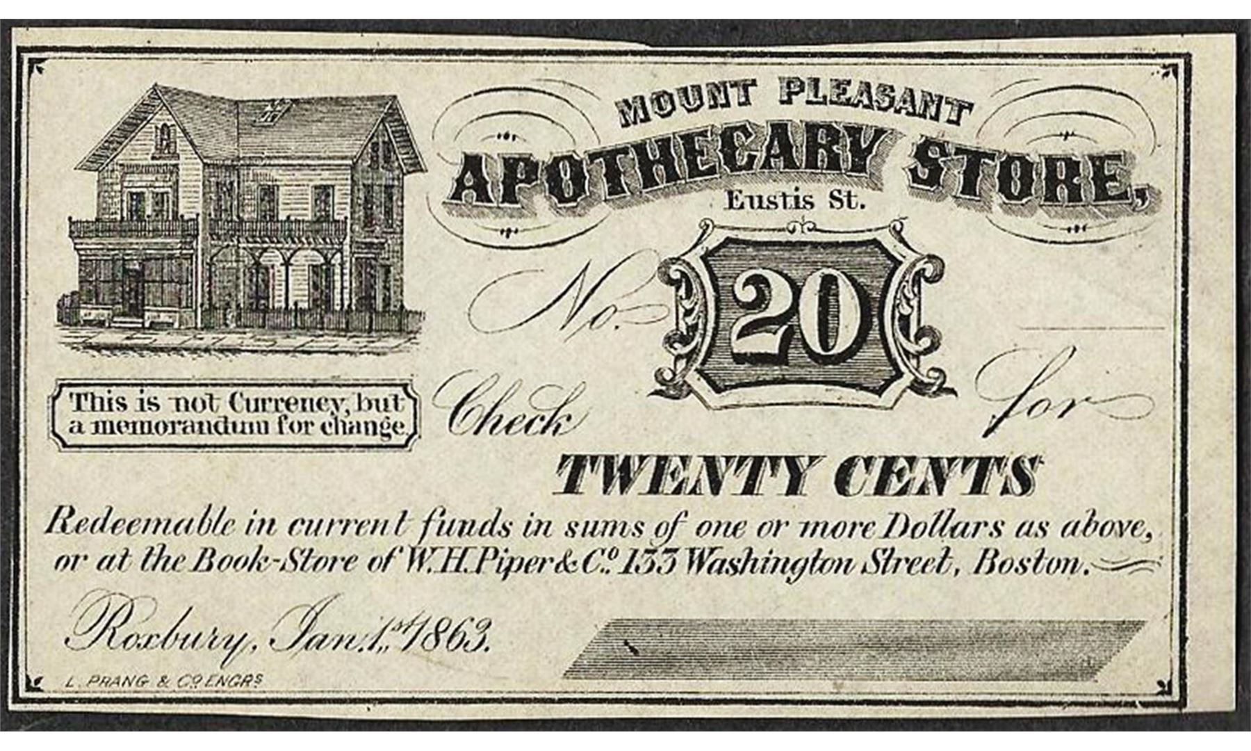 One 1863 Twenty Cents Mount Pleasant, MA Apothecary Store Obsolete Bank Note.