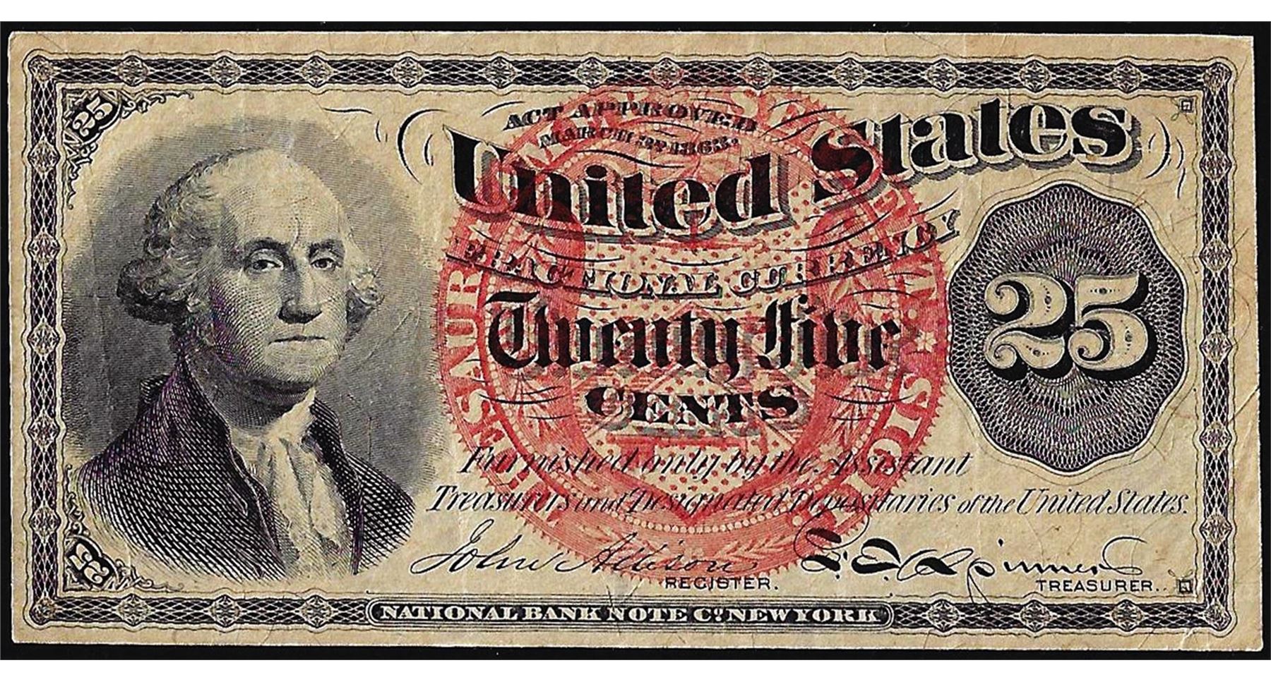 One 1863 Twenty-Five Cents Fourth Issue Fractional Currency Note.