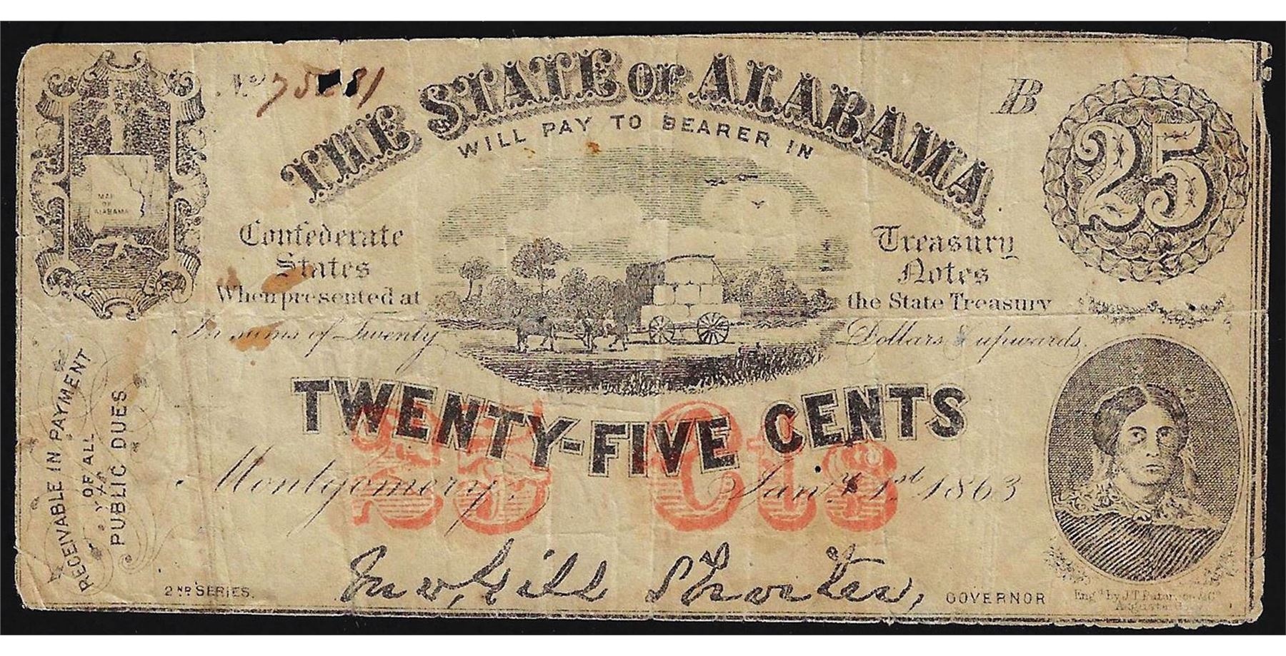 One 1863 Twenty-Five Cents State of Alabama Confederate Note.