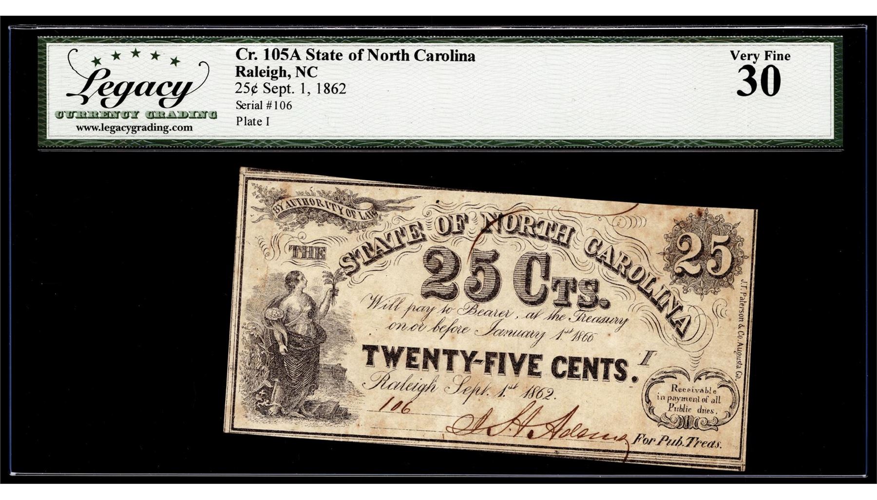 One 1863 Twenty Five Cents State of North Carolina Raleigh, NC Obsolete Note Legacy VF30. Legacy Graded.