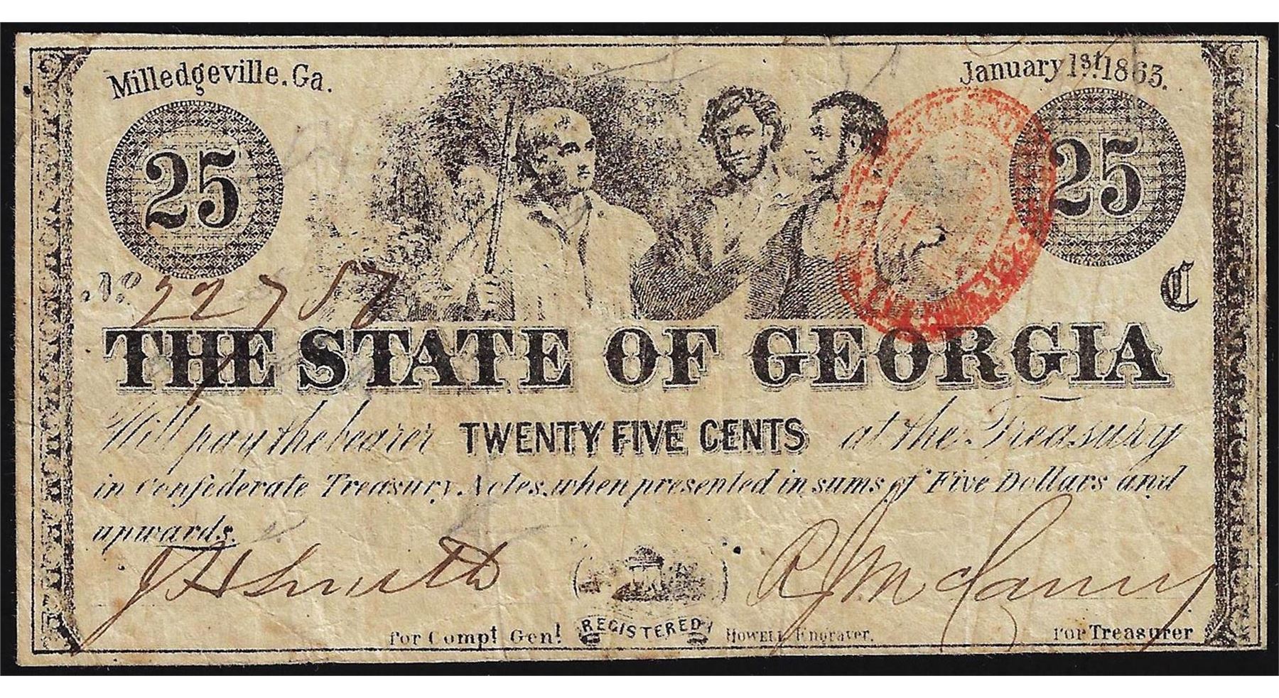 One 1863 Twenty Five Cents The State of Georgia Obsolete Bank Note.