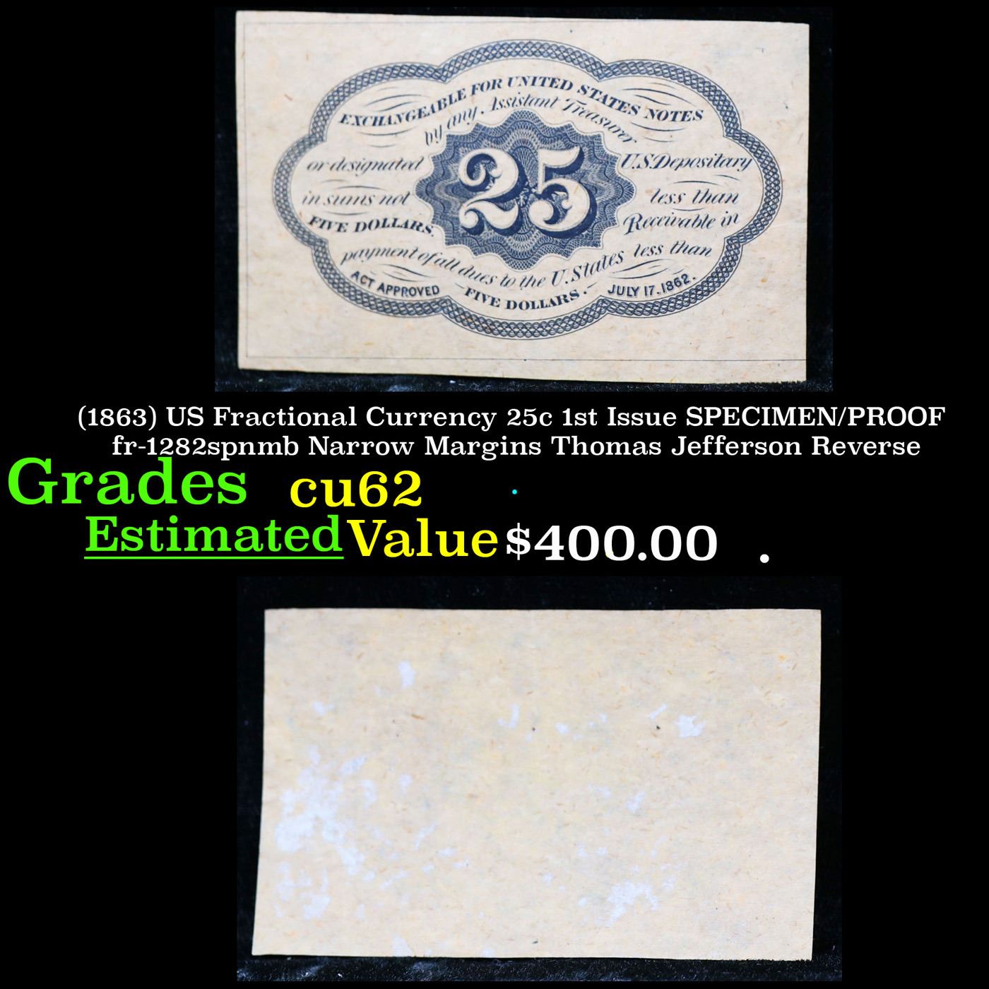 (1863) US Fractional Currency 25c 1st Issue SPECIMEN/PROOF fr-1282spnmb Narrow Margins Thomas Jefferson Reverse Grades Select CU. Specimen Fractional currency All Came From Fractional currency shields which had single-sided specimens were sold to banks to provide a standard for comparison for detecting counterfeits Fractional or postage currency has a rich history. At the beginning of the Civil War people starting hoarding coins for their precious metal content. Coins became difficult to find because of the hoarding. People started to try to use stamps instead of coins as a means of commerce. The government decided to help ease the hoarding issue by issuing “paper coins” also known as postage currency or fractional currency. Fractional currency was first issued on August 21, 1862 and they were last issued on February 15, 1876. Three cents, five cents, ten cents, twenty-five cents, and fifty cents notes were all issued. Fractional currency is physically smaller than other United States money. It also does not have a serial number. A Corey's Pick