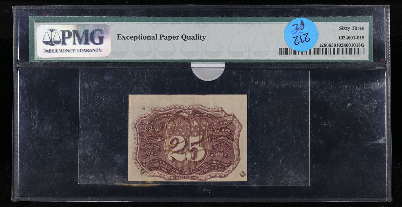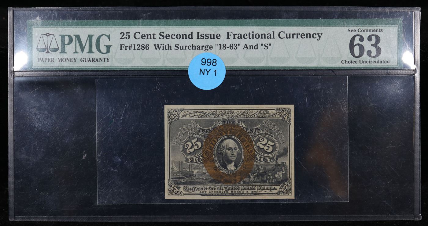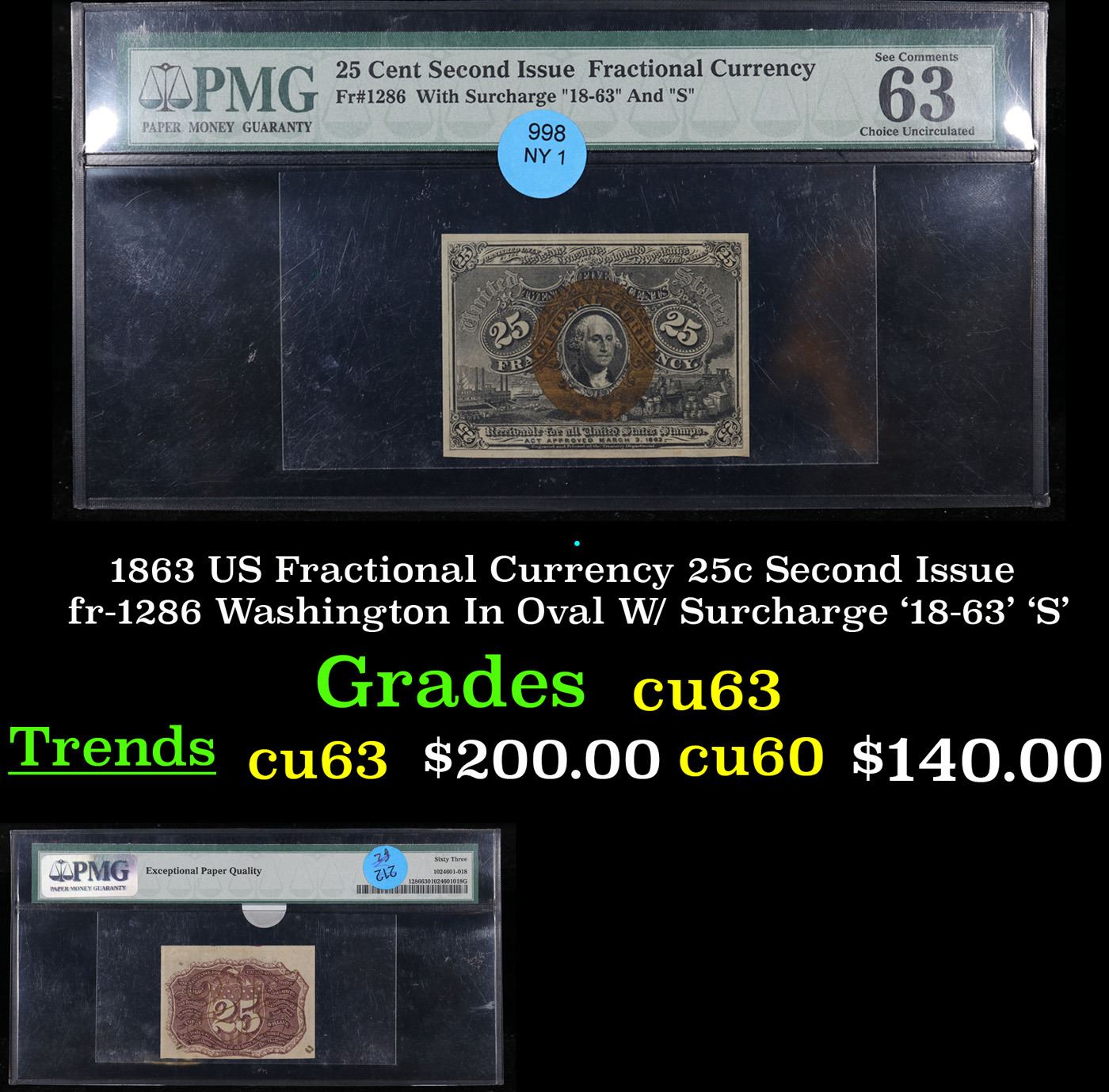 1863 US Fractional Currency 25c Second Issue fr-1286 Washington In Oval W/ Surcharge '18-63' 'S' Graded cu63 By PMG.