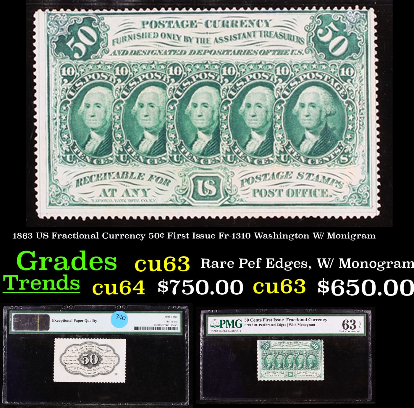 1863 US Fractional Currency 50¢ First Issue Fr-1310 Washington W/ Monigram Graded cu63 By PMG. 0 A very well margined example of this high denomination first issue type that has rich green ink colors and terrific eye appeal. The print quality is sharp with the back design being well centered. Fractional or postage currency has a rich history. At the beginning of the Civil War people starting hoarding coins for their precious metal content. Coins became difficult to find because of the hoarding. People started to try to use stamps instead of coins as a means of commerce. The government decided to help ease the hoarding issue by issuing “paper coins” also known as postage currency or fractional currency. Fractional currency was first issued on August 21, 1862 and they were last issued on February 15, 1876. Three cents, five cents, ten cents, twenty-five cents, and fifty cents notes were all issued. Fractional currency is physically smaller than other United States money. It also does not have a serial number.