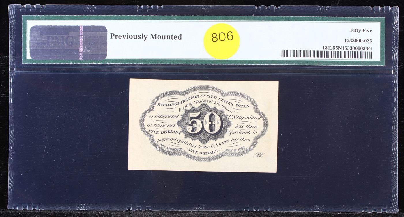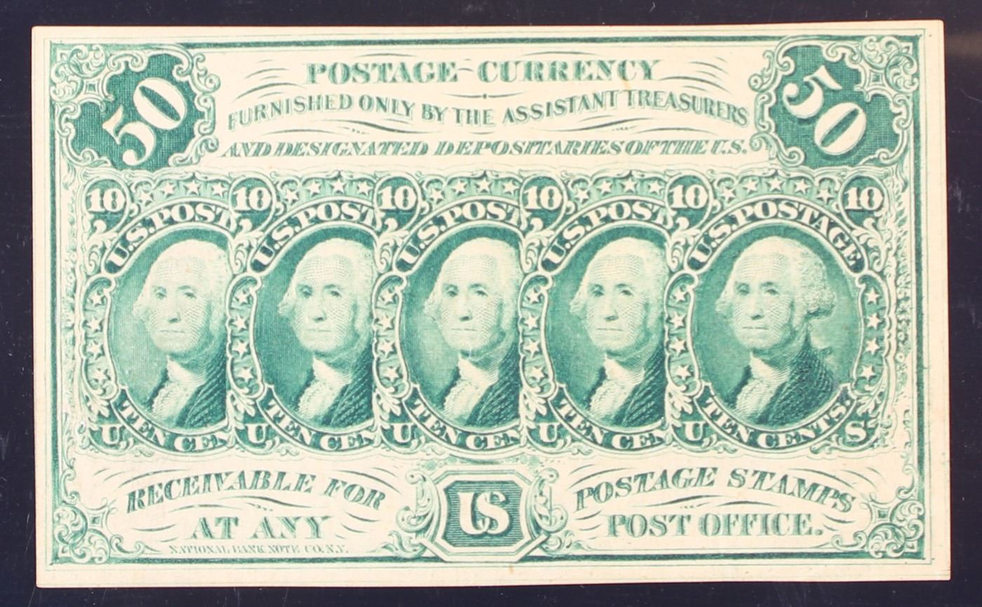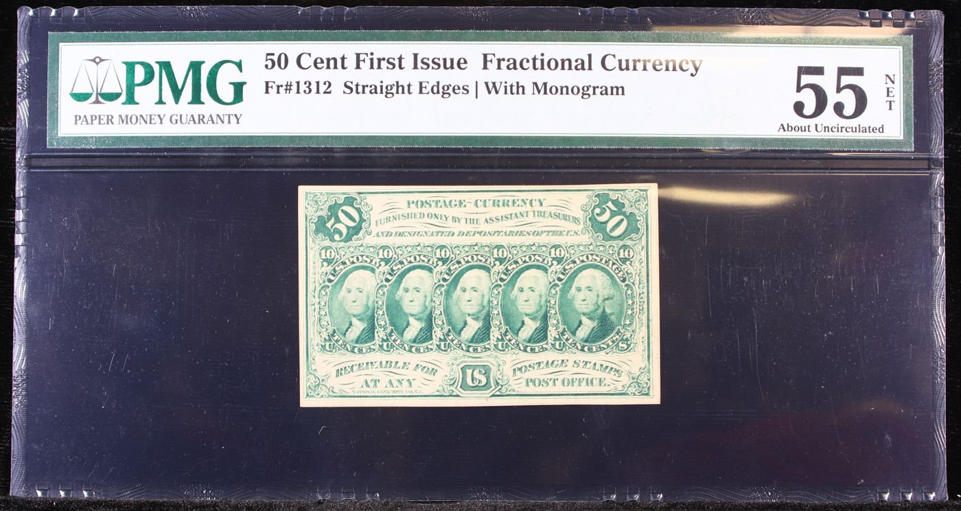 1863 US Fractional Currency 50¢ First Issue Fr-1312 Washington W/ Monigram Graded au55 By PMG. Fractional or postage currency has a rich history. At the beginning of the Civil War people starting hoarding coins for their precious metal content. Coins became difficult to find because of the hoarding. People started to try to use stamps instead of coins as a means of commerce. The government decided to help ease the hoarding issue by issuing “paper coins” also known as postage currency or fractional currency. Fractional currency was first issued on August 21, 1862 and they were last issued on February 15, 1876. Three cents, five cents, ten cents, twenty-five cents, and fifty cents notes were all issued. Fractional currency is physically smaller than other United States money. It also does not have a serial number.