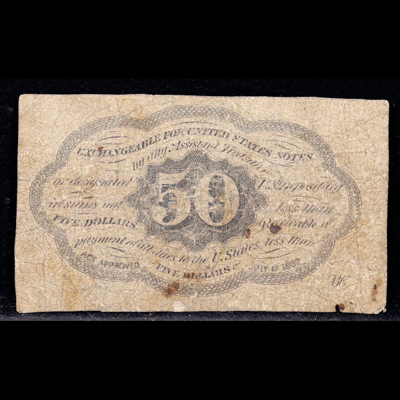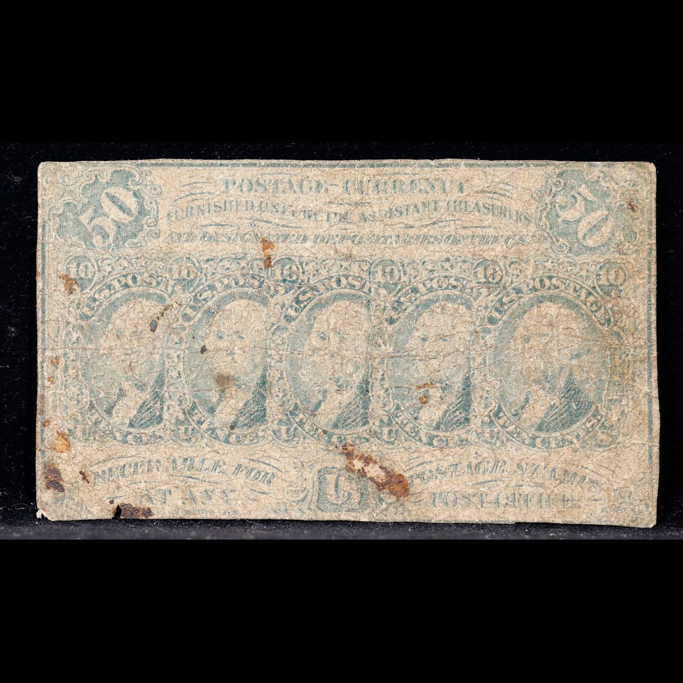 1863 US Fractional Currency 50¢ First Issue Fr-1312 Washington W/ Monigram Grades vg, very good. Fractional or postage currency has a rich history. At the beginning of the Civil War people starting hoarding coins for their precious metal content. Coins became difficult to find because of the hoarding. People started to try to use stamps instead of coins as a means of commerce. The government decided to help ease the hoarding issue by issuing “paper coins” also known as postage currency or fractional currency. Fractional currency was first issued on August 21, 1862 and they were last issued on February 15, 1876. Three cents, five cents, ten cents, twenty-five cents, and fifty cents notes were all issued. Fractional currency is physically smaller than other United States money. It also does not have a serial number.