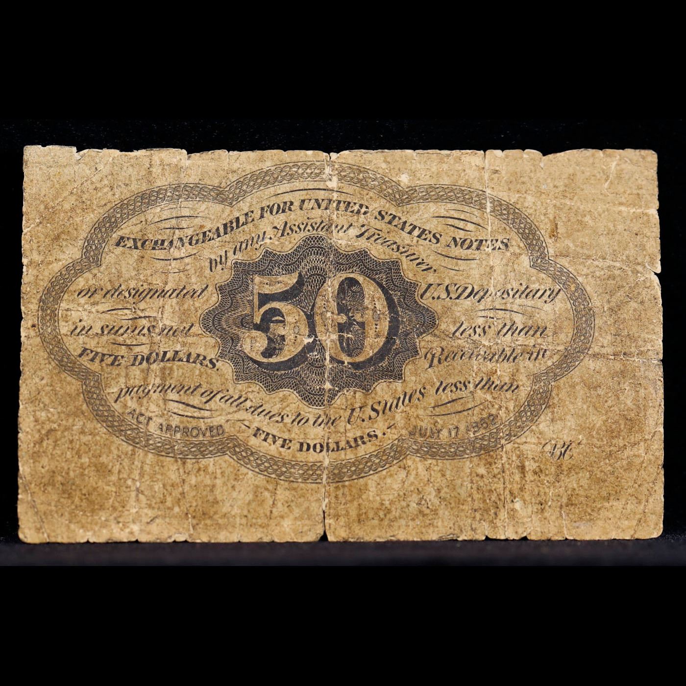 1863 US Fractional Currency 50¢ First Issue Fr-1312 Washington W/ Monigram Grades vg, very good. Fractional or postage currency has a rich history. At the beginning of the Civil War people starting hoarding coins for their precious metal content. Coins became difficult to find because of the hoarding. People started to try to use stamps instead of coins as a means of commerce. The government decided to help ease the hoarding issue by issuing “paper coins” also known as postage currency or fractional currency. Fractional currency was first issued on August 21, 1862 and they were last issued on February 15, 1876. Three cents, five cents, ten cents, twenty-five cents, and fifty cents notes were all issued. Fractional currency is physically smaller than other United States money. It also does not have a serial number.