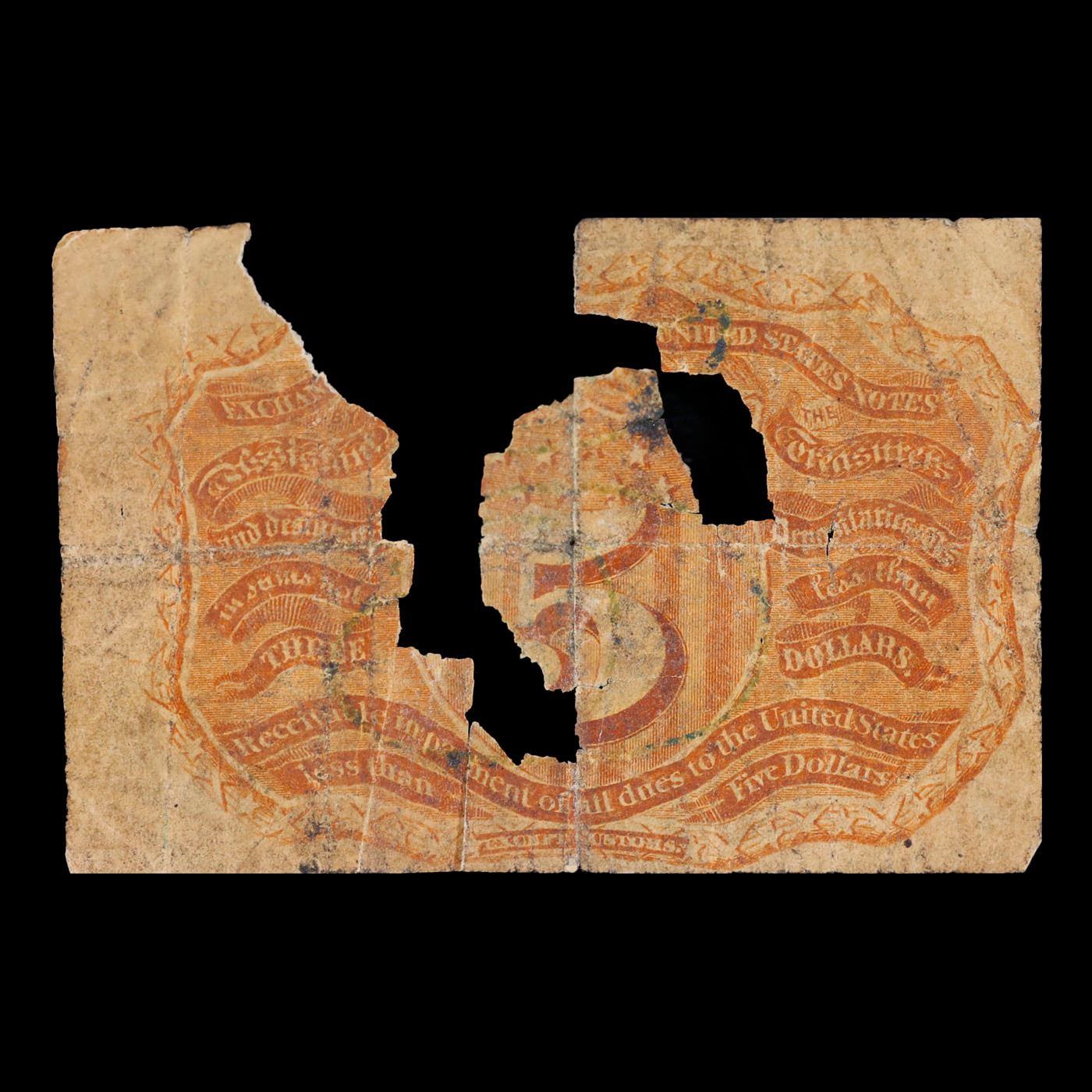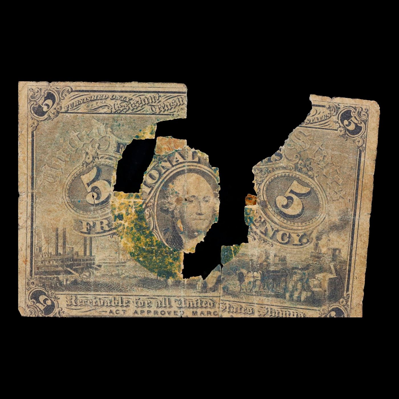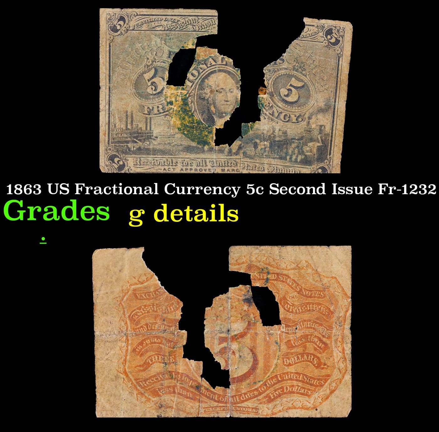 1863 US Fractional Currency 5c Second Issue Fr-1232 Grades g details. Fractional or postage currency has a rich history. At the beginning of the Civil War people starting hoarding coins for their precious metal content. Coins became difficult to find because of the hoarding. People started to try to use stamps instead of coins as a means of commerce. The government decided to help ease the hoarding issue by issuing “paper coins” also known as postage currency or fractional currency. Fractional currency was first issued on August 21, 1862 and they were last issued on February 15, 1876. Three cents, five cents, ten cents, twenty-five cents, and fifty cents notes were all issued. Fractional currency is physically smaller than other United States money. It also does not have a serial number.