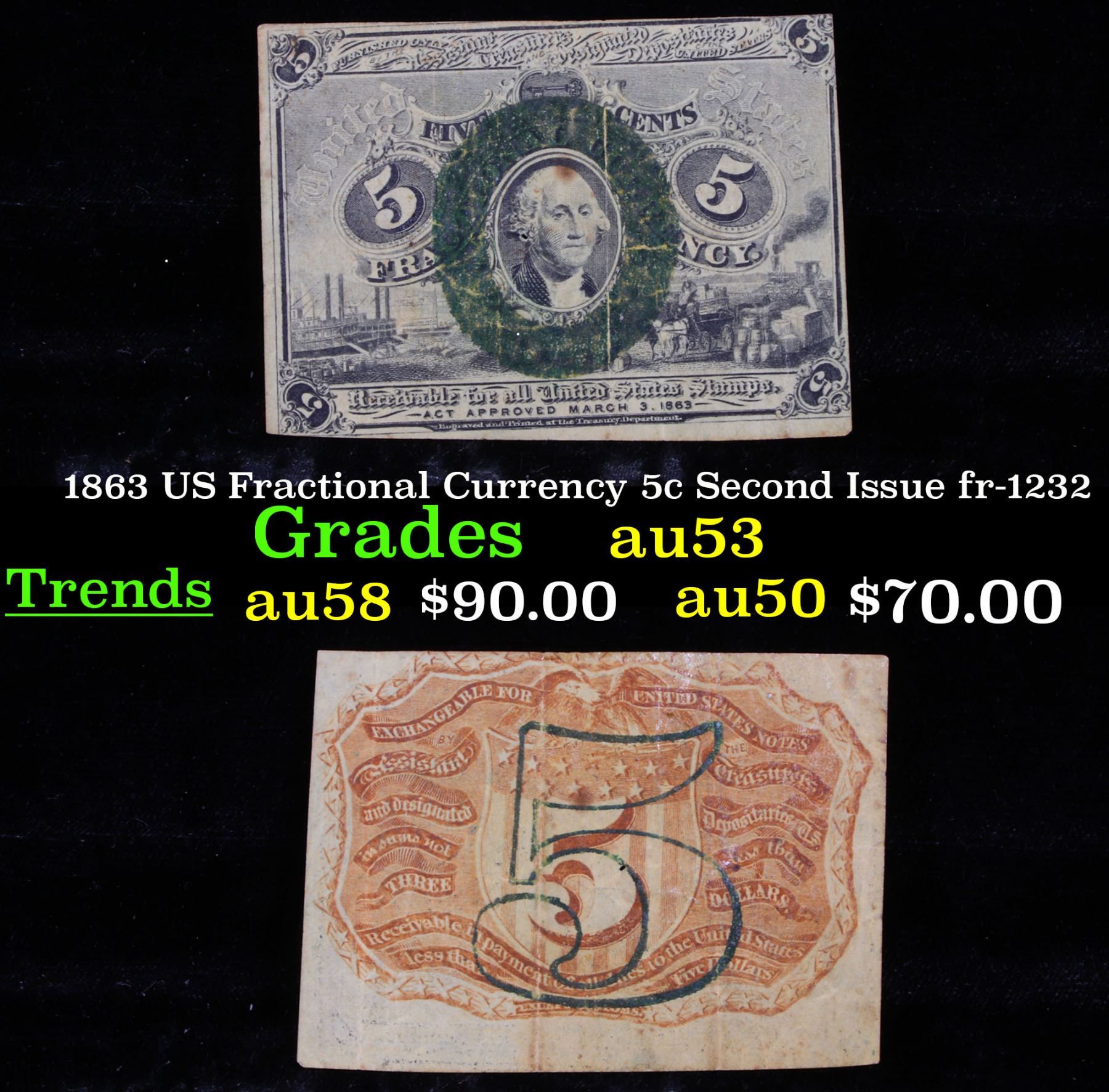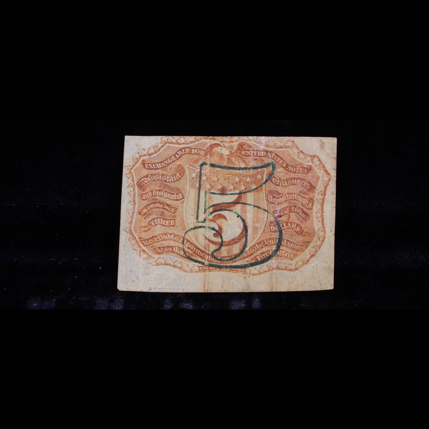 1863 US Fractional Currency 5c Second Issue fr-1232 Grades Select AU. Fractional or postage currency has a rich history. At the beginning of the Civil War people starting hoarding coins for their precious metal content. Coins became difficult to find because of the hoarding. People started to try to use stamps instead of coins as a means of commerce. The government decided to help ease the hoarding issue by issuing “paper coins” also known as postage currency or fractional currency. Fractional currency was first issued on August 21, 1862 and they were last issued on February 15, 1876. Three cents, five cents, ten cents, twenty-five cents, and fifty cents notes were all issued. Fractional currency is physically smaller than other United States money. It also does not have a serial number.