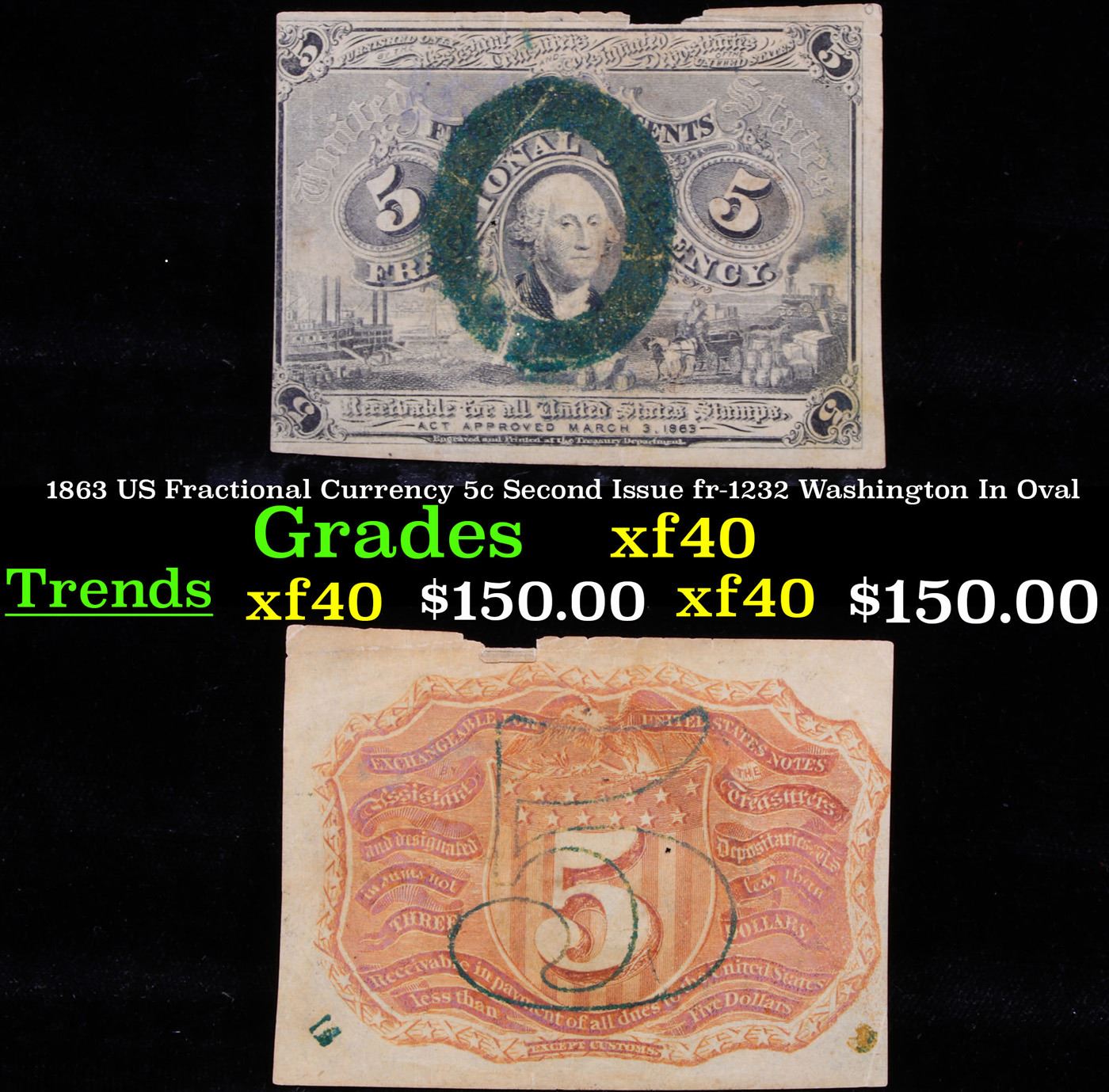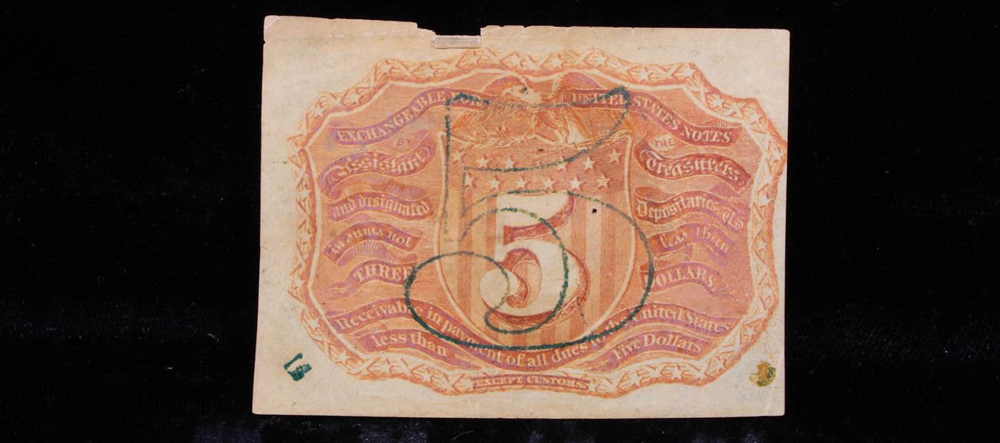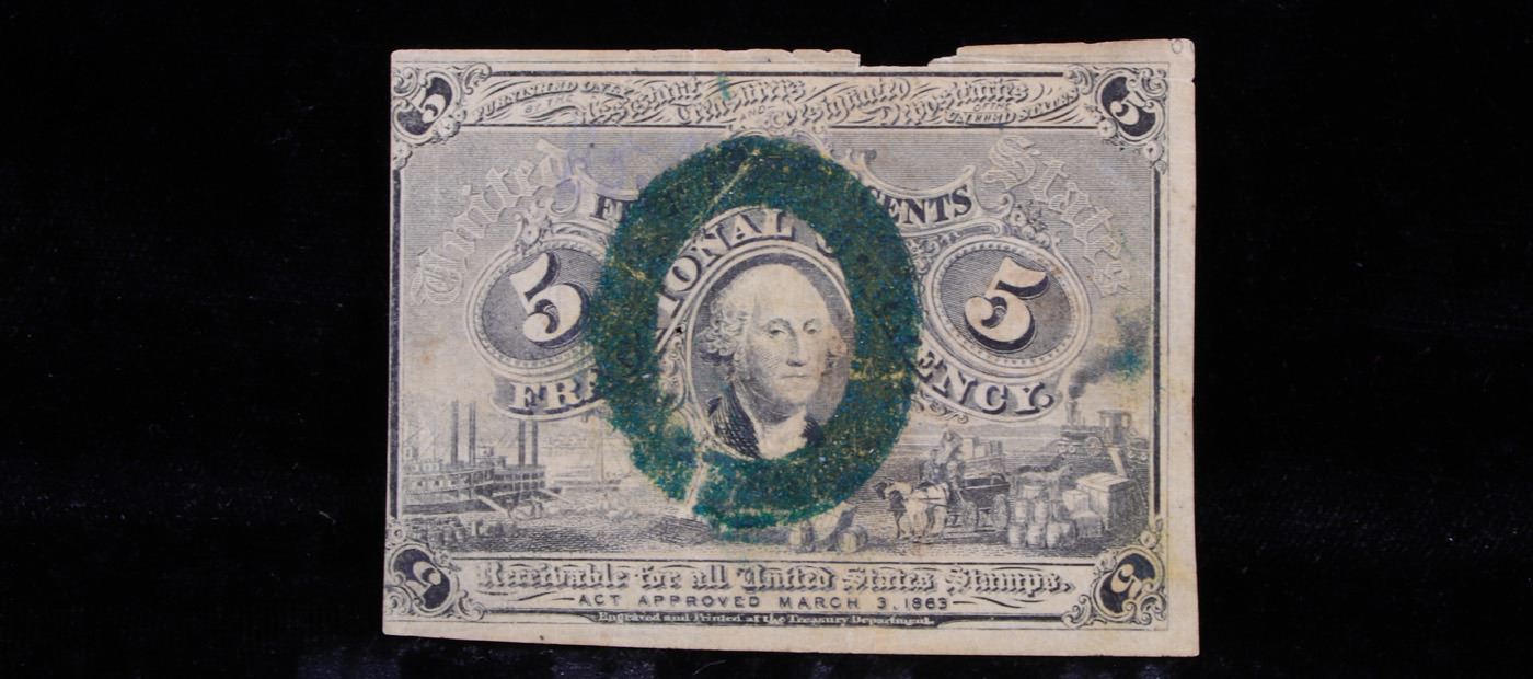 1863 US Fractional Currency 5c Second Issue fr-1232 Washington In Oval xf. Fractional or postage currency has a rich history. At the beginning of the Civil War people starting hoarding coins for their precious metal content. Coins became difficult to find because of the hoarding. People started to try to use stamps instead of coins as a means of commerce. The government decided to help ease the hoarding issue by issuing “paper coins” also known as postage currency or fractional currency. Fractional currency was first issued on August 21, 1862 and they were last issued on February 15, 1876. Three cents, five cents, ten cents, twenty-five cents, and fifty cents notes were all issued. Fractional currency is physically smaller than other United States money. It also does not have a serial number.
