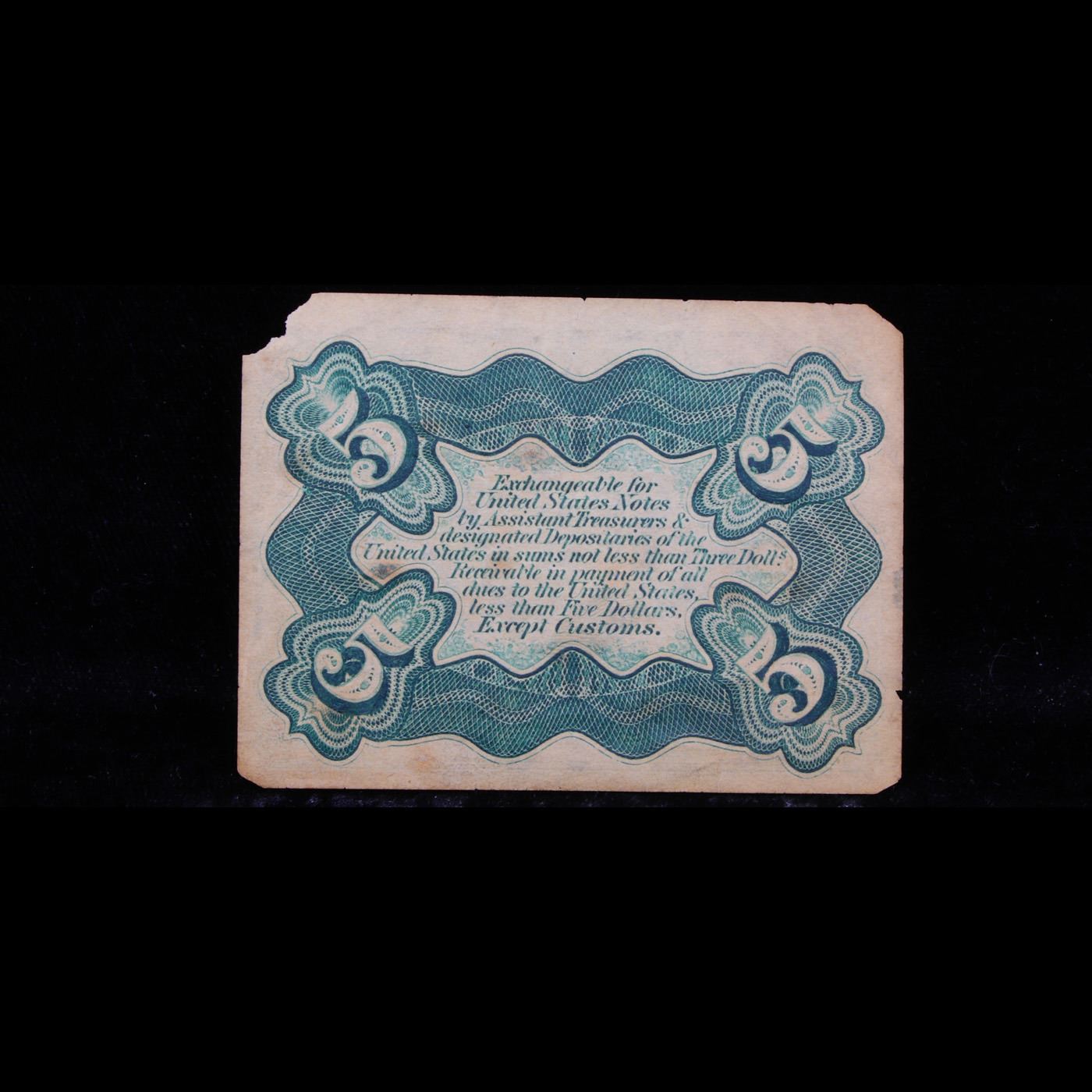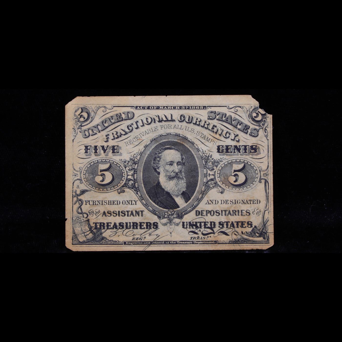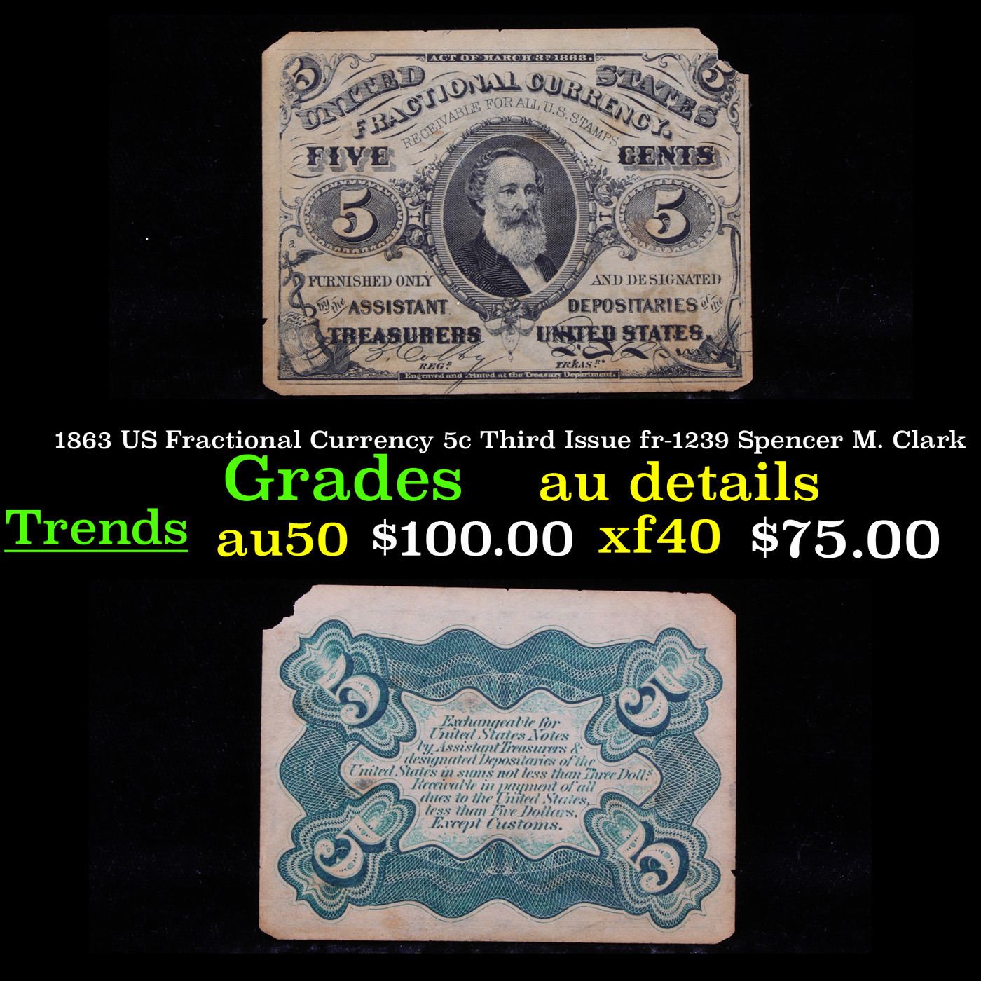 1863 US Fractional Currency 5c Third Issue fr-1239 Spencer M. Clark Grades AU Details. Fractional or postage currency has a rich history. At the beginning of the Civil War people starting hoarding coins for their precious metal content. Coins became difficult to find because of the hoarding. People started to try to use stamps instead of coins as a means of commerce. The government decided to help ease the hoarding issue by issuing “paper coins” also known as postage currency or fractional currency. Fractional currency was first issued on August 21, 1862 and they were last issued on February 15, 1876. Three cents, five cents, ten cents, twenty-five cents, and fifty cents notes were all issued. Fractional currency is physically smaller than other United States money. It also does not have a serial number.