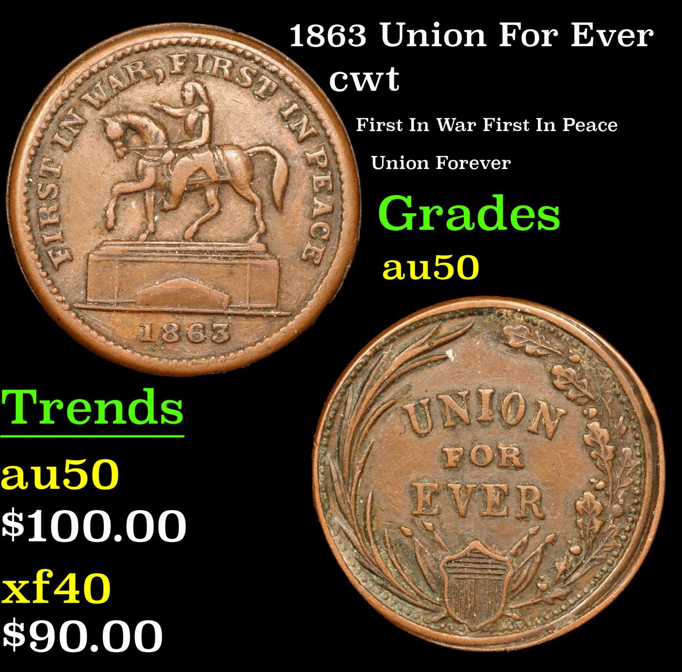 1863 Union For Ever Civil War Token 1c Grades AU, Almost Unc.