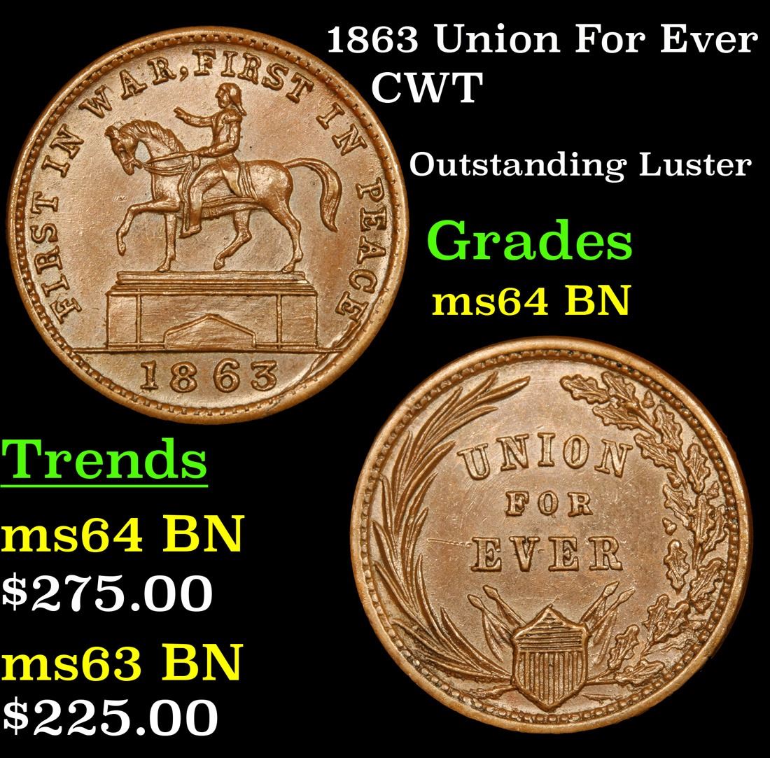 1863 Union For Ever Outstanding Luster . Civil War Token 1c Grades Choice Unc BN. A Corey's Pick, Bid to Win, Don't let it get Away, you might not find its equal Coin