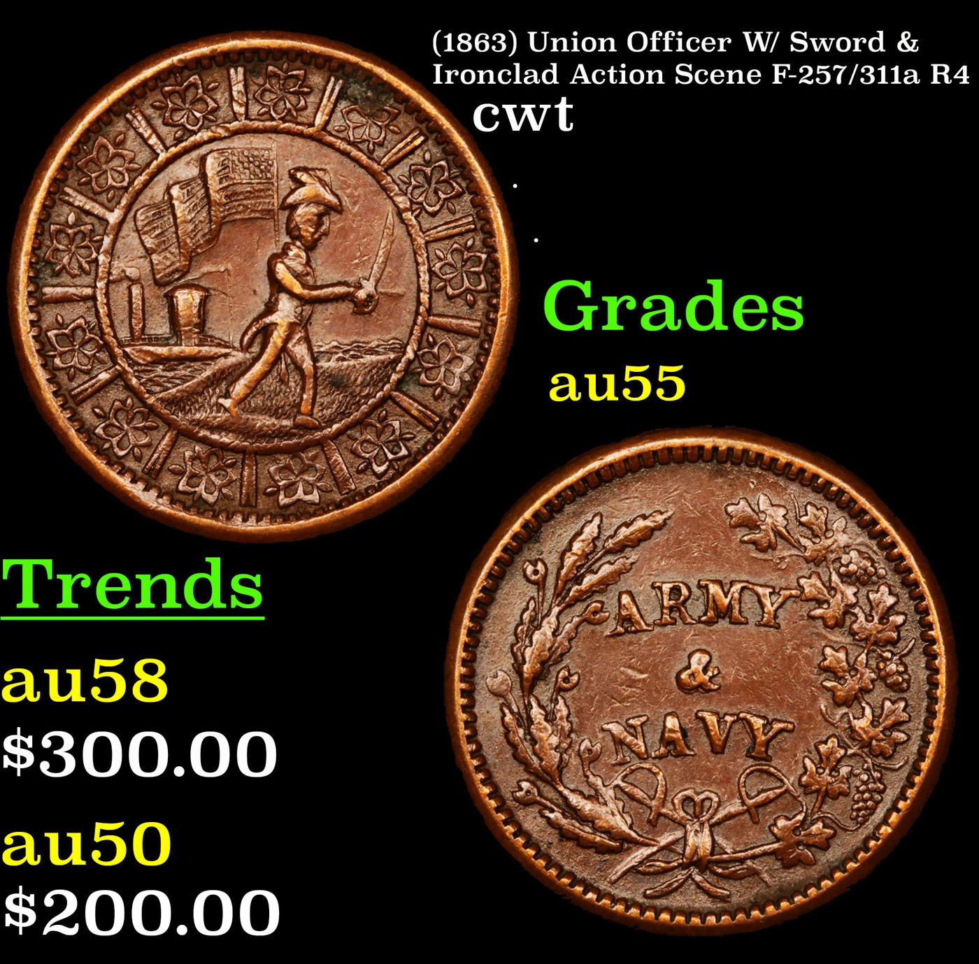 (1863) Union Officer W/ Sword & Ironclad Action Scene F-257/311a R4 Civil War Token 1c Grades Choice