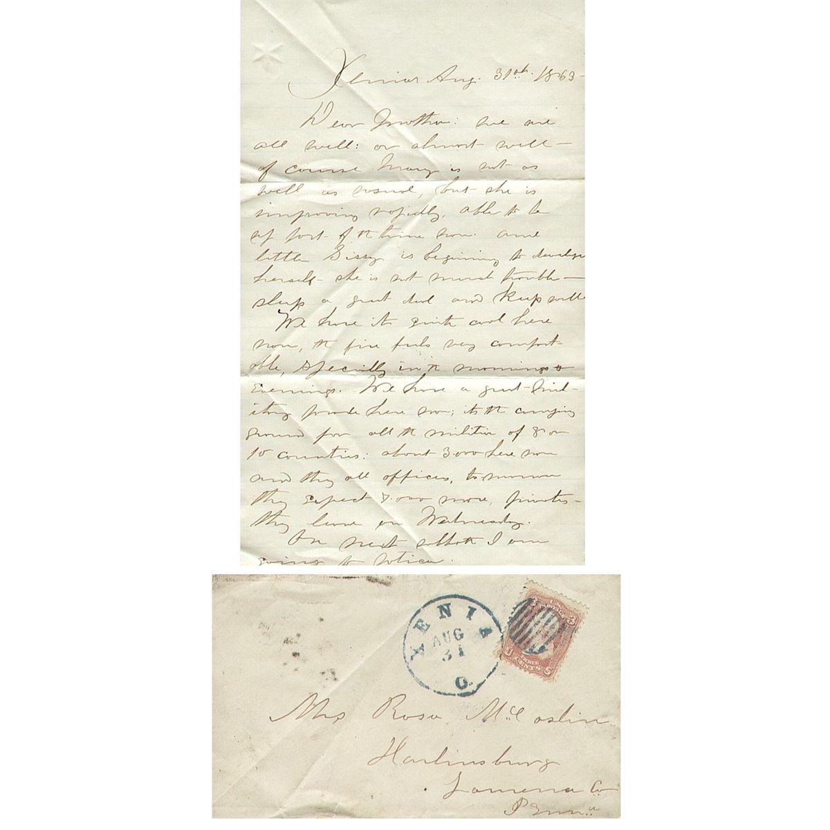 ALS from an unidentified Union soldier to his mother. Accompanied by cover. Dated 31 August 1863, letter reads in part: ''…we are all well: or almost well - of course Mary is not well…but she is improving rapidly…We have a great…infantry…here soon; it's the carrying ground for all the militia of 8 or 10 counties: about 3,000 here soon and they all officers. Tomorrow they expect 7,000 more…they leave on Wednesday…Your son Robert…'' 1.5pp. ink letter measures 5'' x 8.5''. Some creasing, otherwise near fine condition.