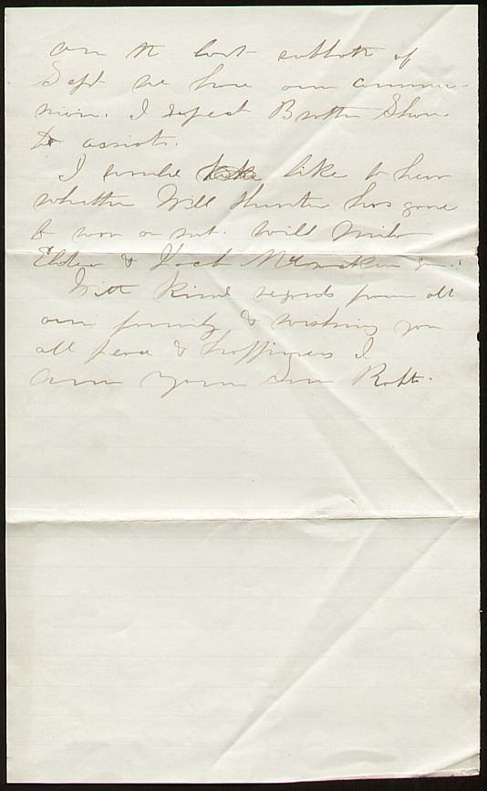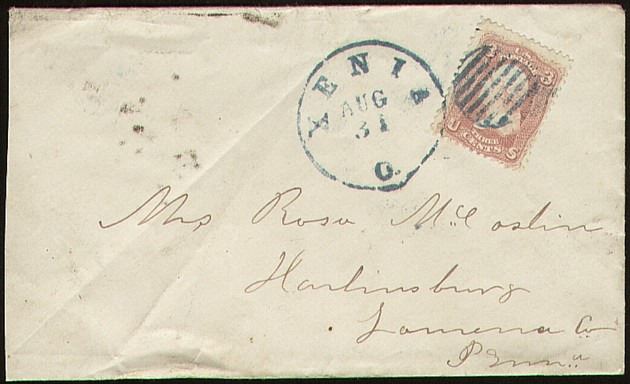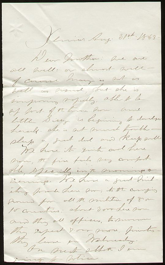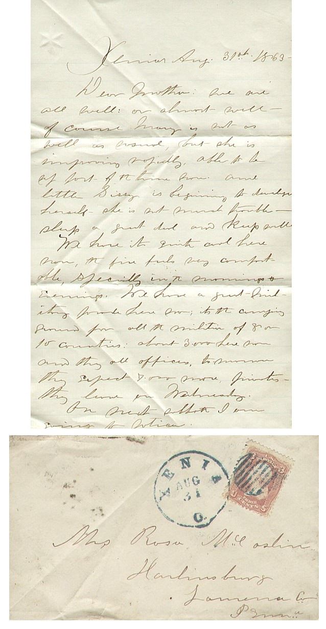 ALS from an unidentified Union soldier to his mother. Accompanied by cover. Dated 31 August 1863, letter reads in part: ''...we are all well: or almost well - of course Mary is not well...but she is improving rapidly...We have a great...infantry...here soon; it's the carrying ground for all the militia of 8 or 10 counties: about 3,000 here soon and they all officers. Tomorrow they expect 7,000 more...they leave on Wednesday...Your son Robert...'' 1.5pp. ink letter measures 5'' x 8.5''. Some creasing, otherwise near fine condition.
