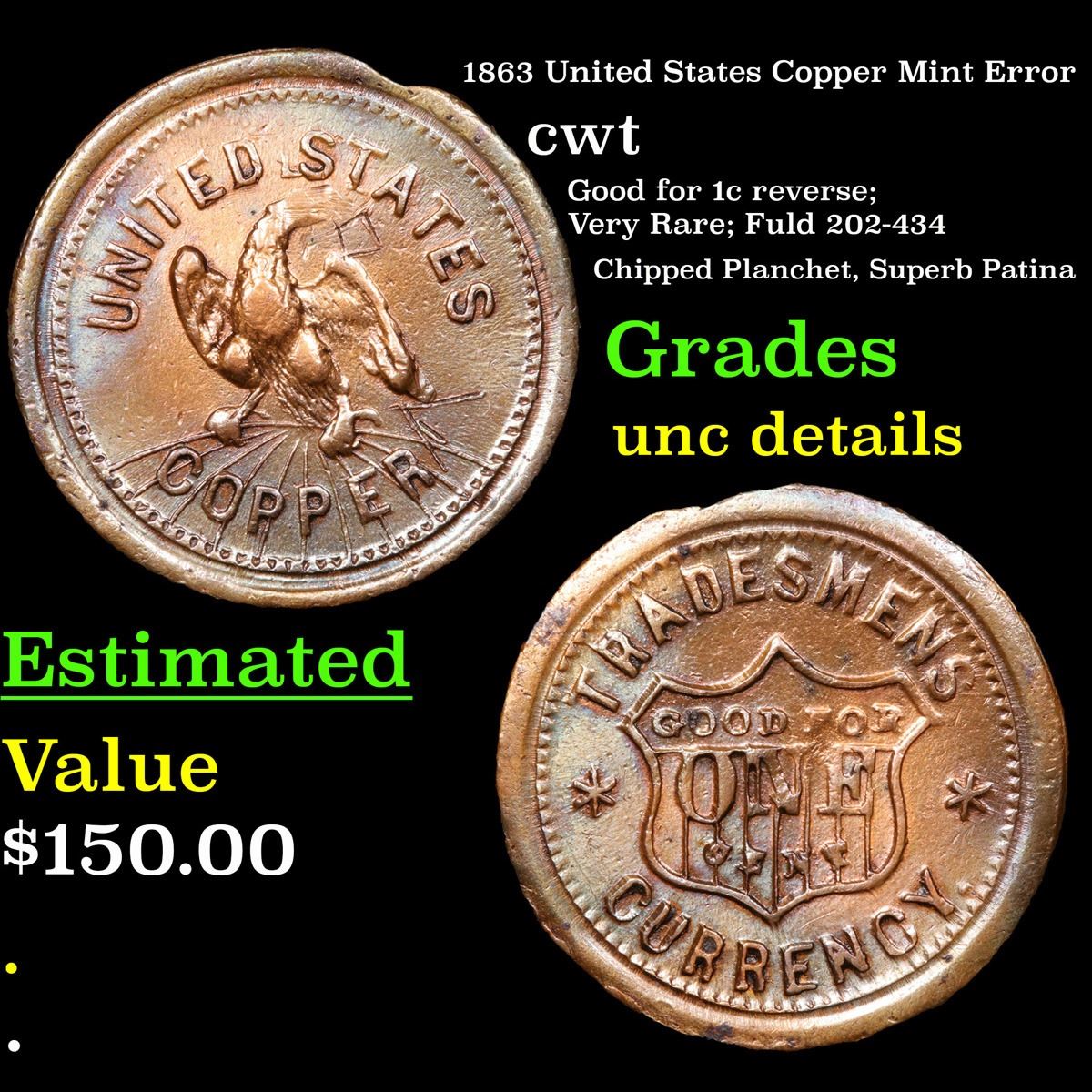 1863 United States Copper Mint Error Good for 1c reverse; Very Rare; Fuld 202-434 Chipped Planchet, Superb Patina Civil War Token 1c Grades Unc Details.