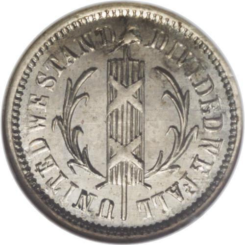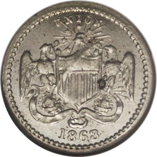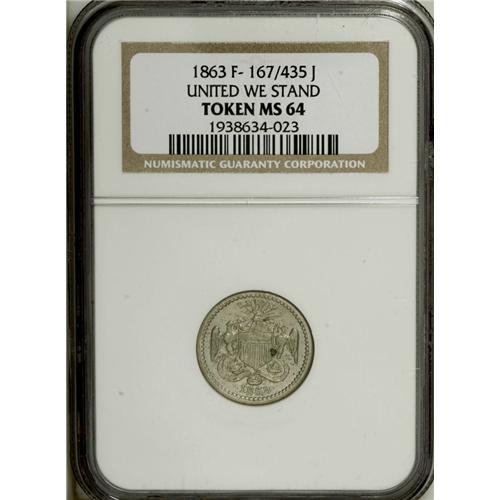 <B>1863 United We Stand Divided We Fall, Fuld 167/435J, R.8, MS64 NGC.</B></I> German silver. This very scarce token is listed in the <I>Civil War Token Collectors Guide</B></I> by Kanzinger. The token exhibits a light gray appearance with an abundance of original mint luster. The current MS60 catalog value is $230.<BR><BR><b>Shipping:</b> Coin/Currency (<a target="_blank" href="http://www.heritageauctions.com/common/shipping.php">view shipping information</a>)
