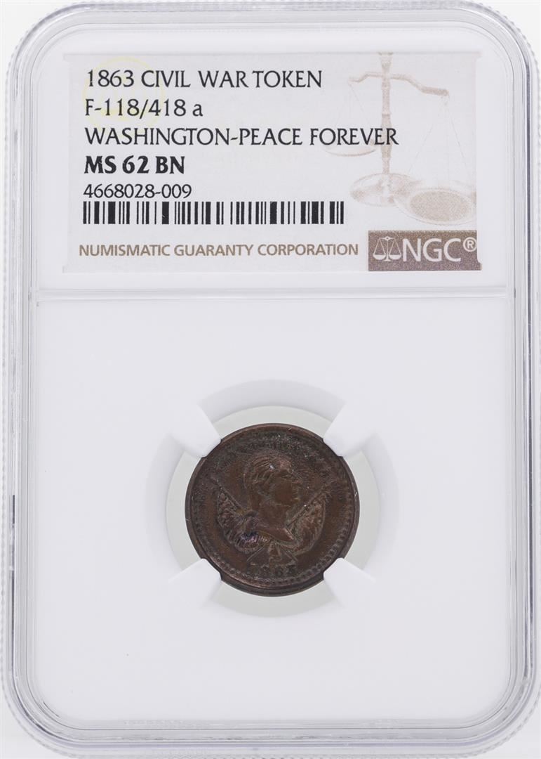 One 1863 Washington-Peace Forever Civil War Token NGC MS62BN. NGC Certified.