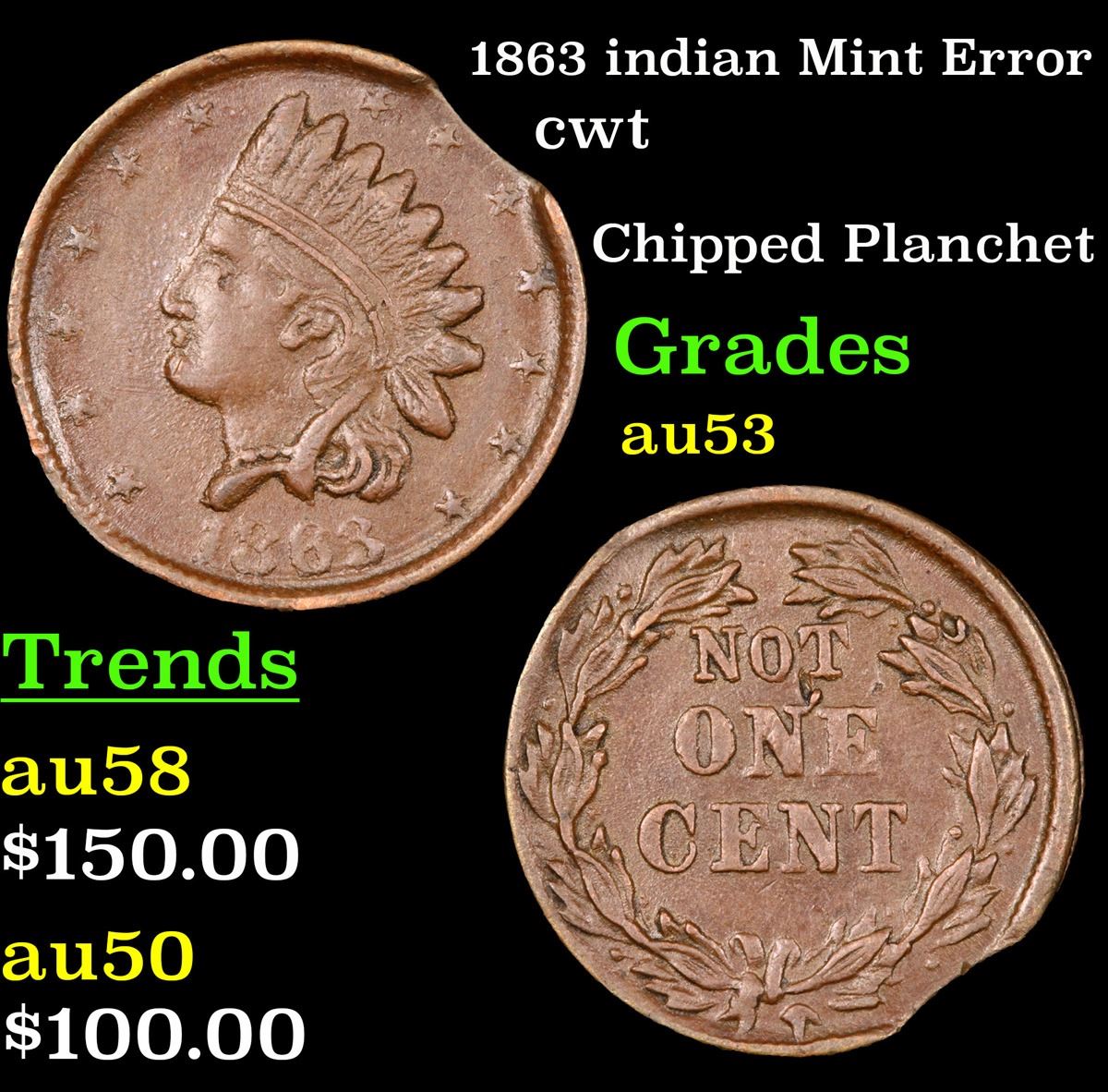 1863 indian Mint Error Chipped Planchet . Civil War Token 1c Grades Select AU.