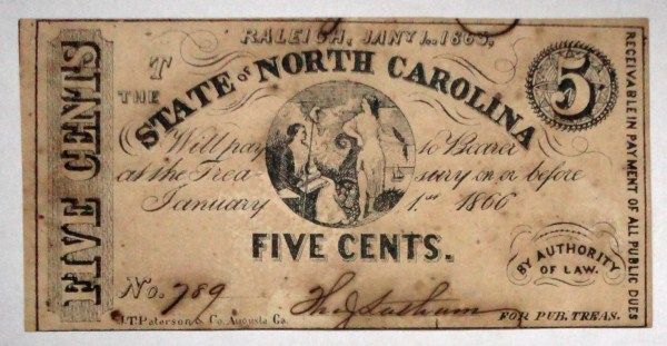 1863 state of North Carolina Raleigh 5 cent promisary note
