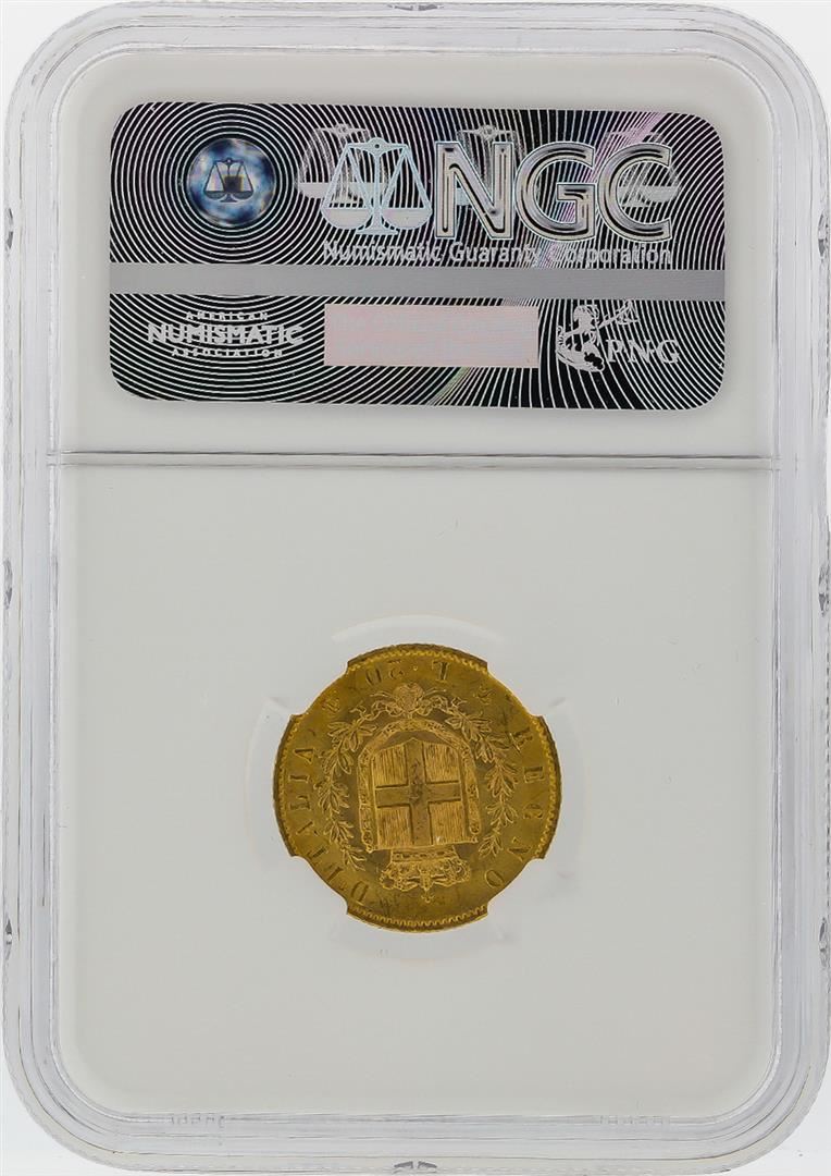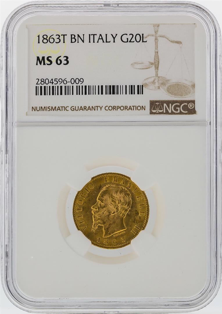 One 1863T BN Italy 20 Lire Gold Coin NGC Graded MS63. NGC Certified.