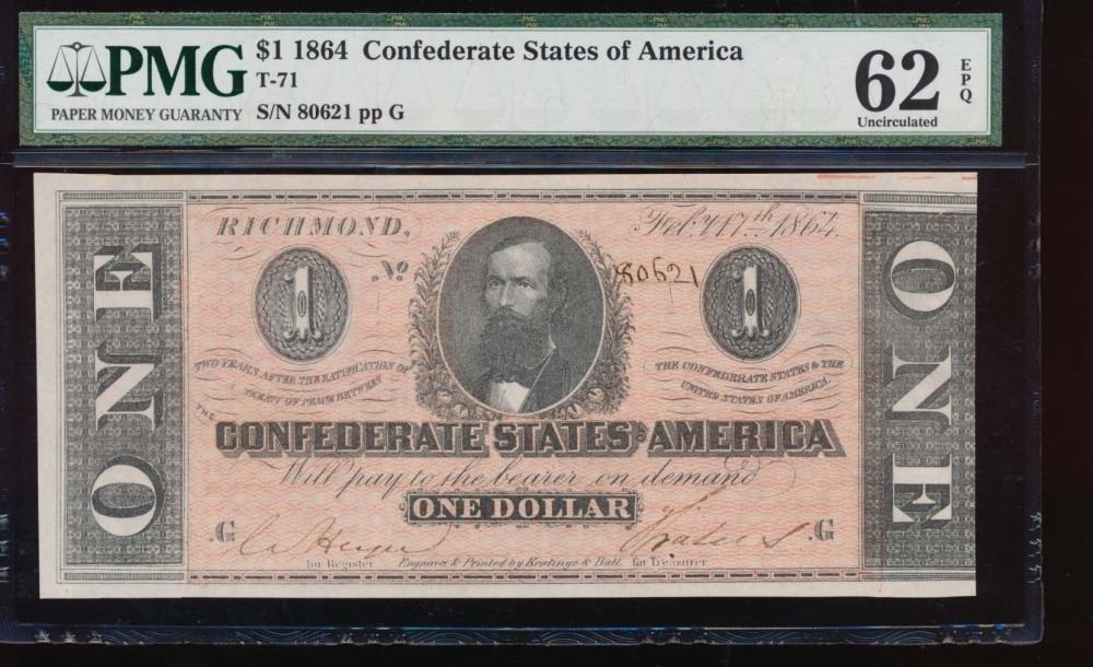 One 1864 $1 Confederate States of America Note PMG 62EPQ.