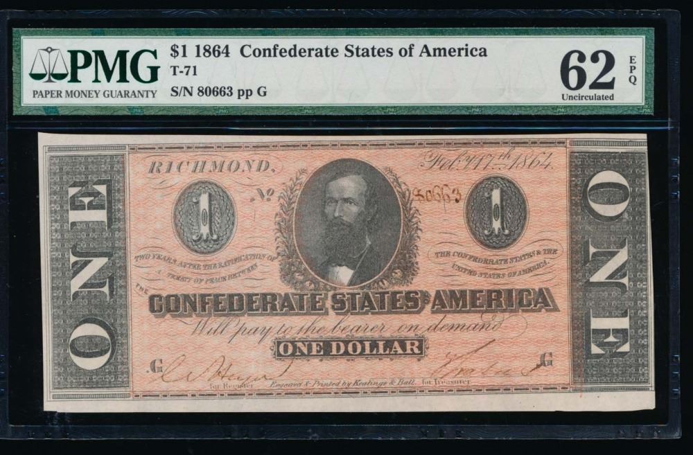 One 1864 $1 Confederate States of America Note PMG 62EPQ.